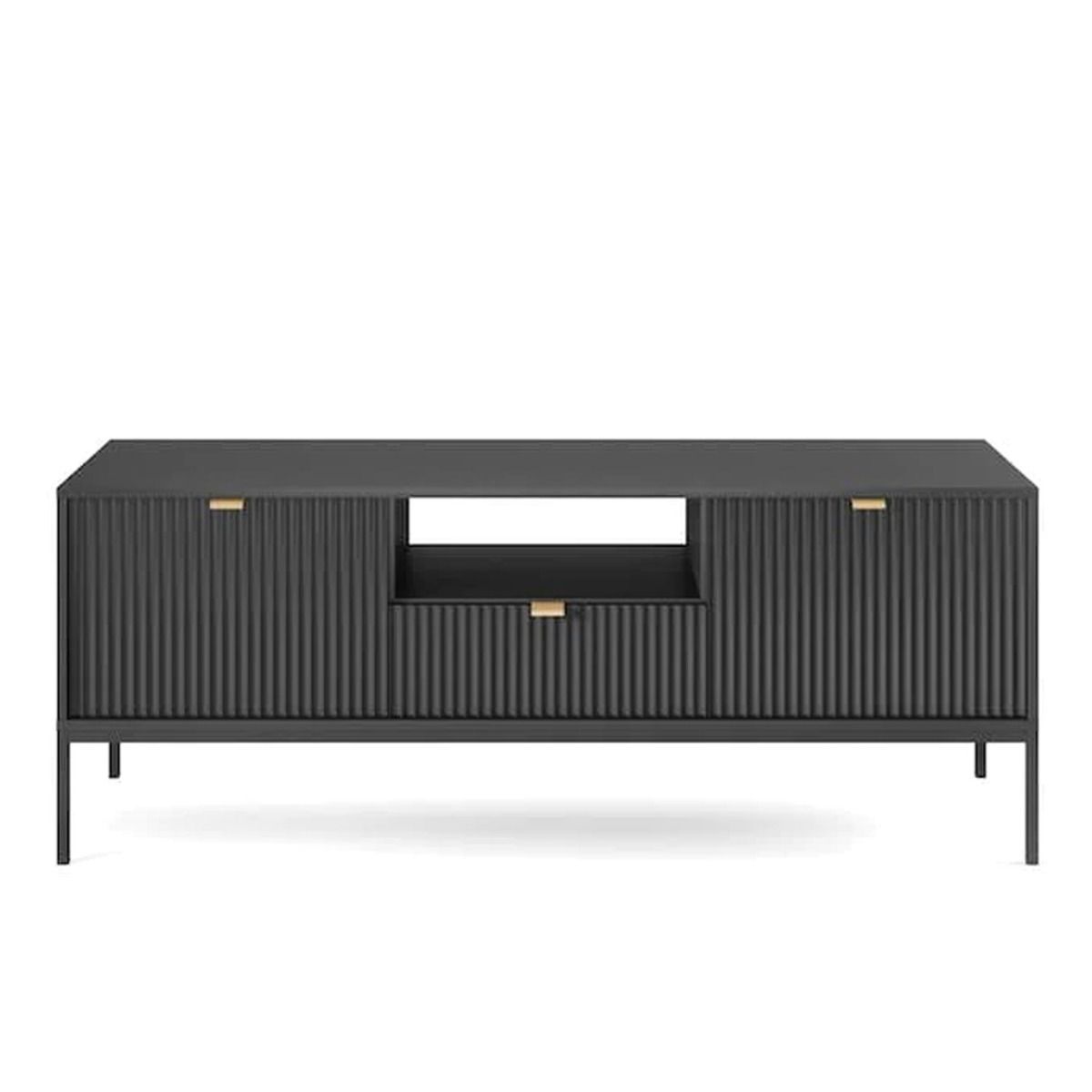Introducing the Galadriel Nyx TV Cabinet – the epitome of modern design and functionality. This sleek cabinet seamlessly integrates into any contemporary space, featuring two hinged doors, one drawer, and an open compartment for all your entertainment essentials. With a stylish black metal leg scheme, it effortlessly complements any decor, bringing a touch of sophistication to your living area. Crafted from high-quality 16mm laminated board and reinforced with ABS edging, this TV cabinet ensures durability and longevity. Assembling it is a breeze, guaranteeing an instant upgrade to your entertainment setup.