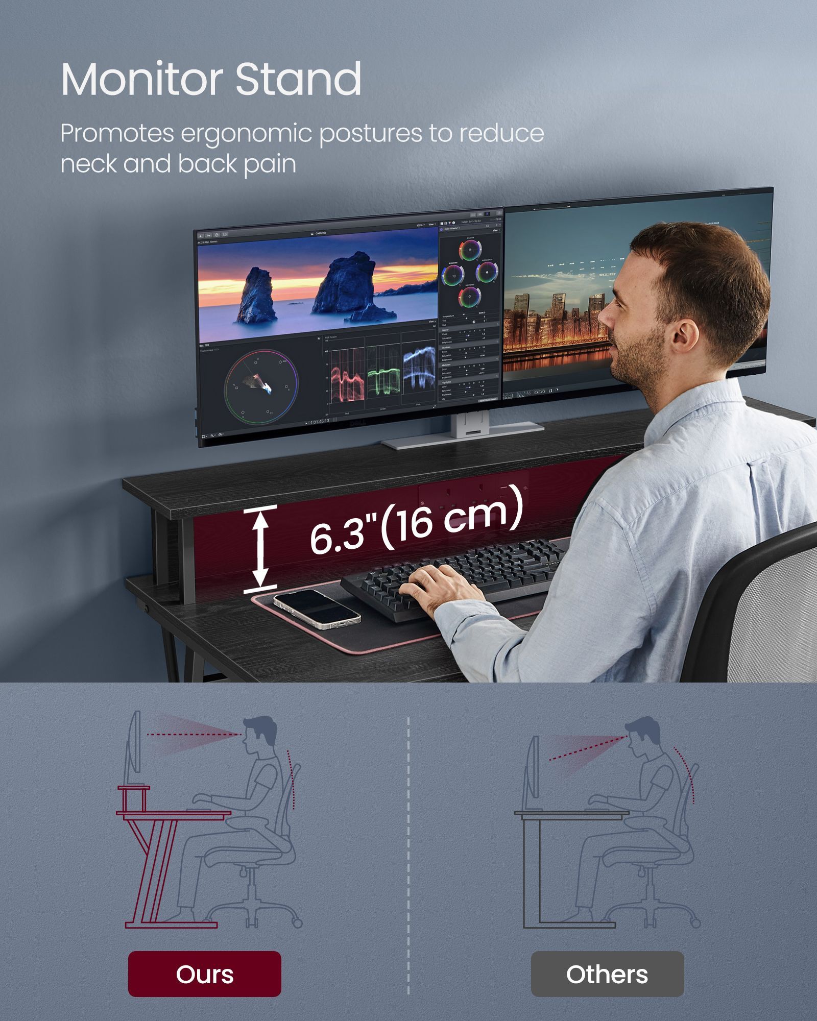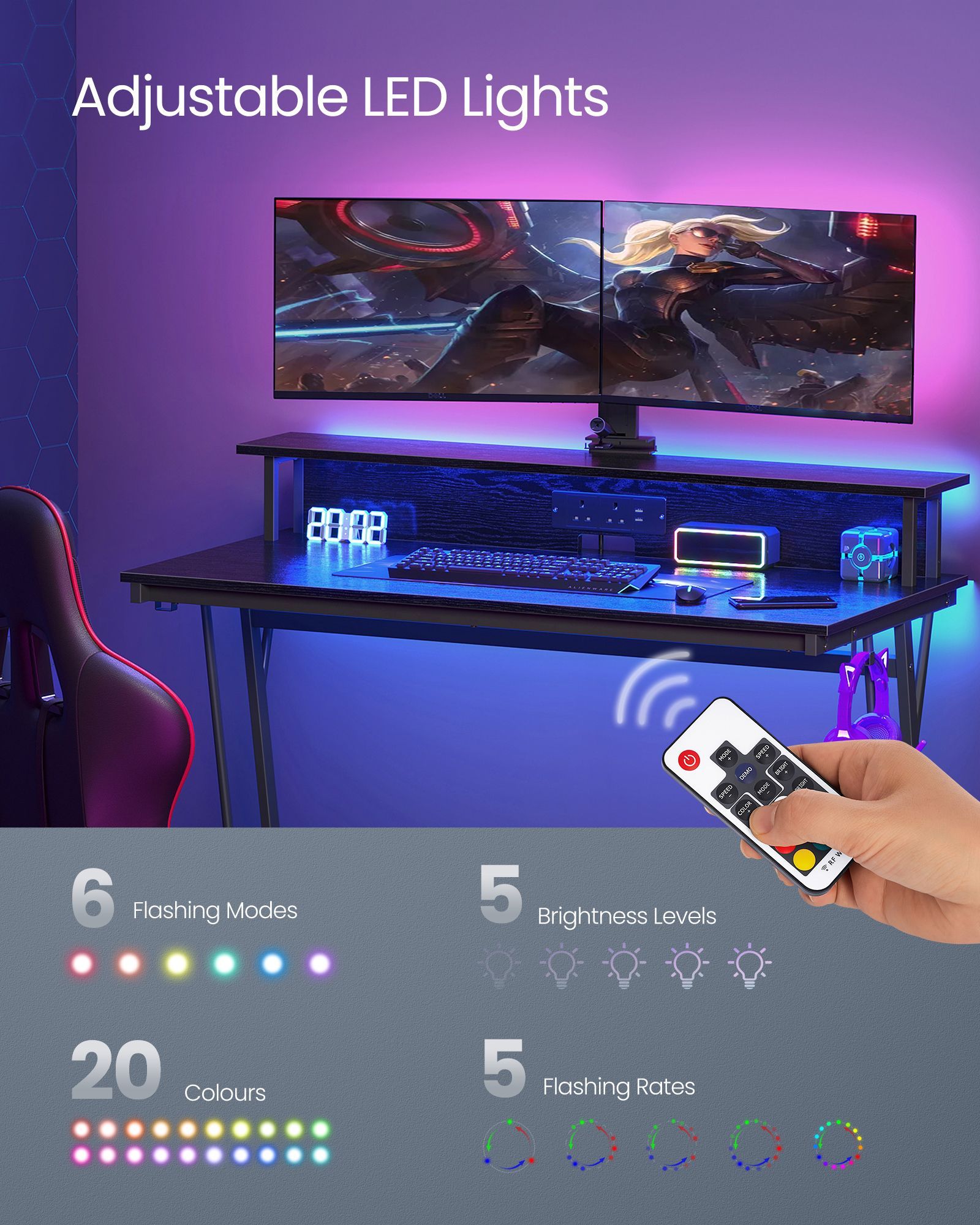 Gaming Desk with LED Lights and Built-In Power Outlets - Ebony Black