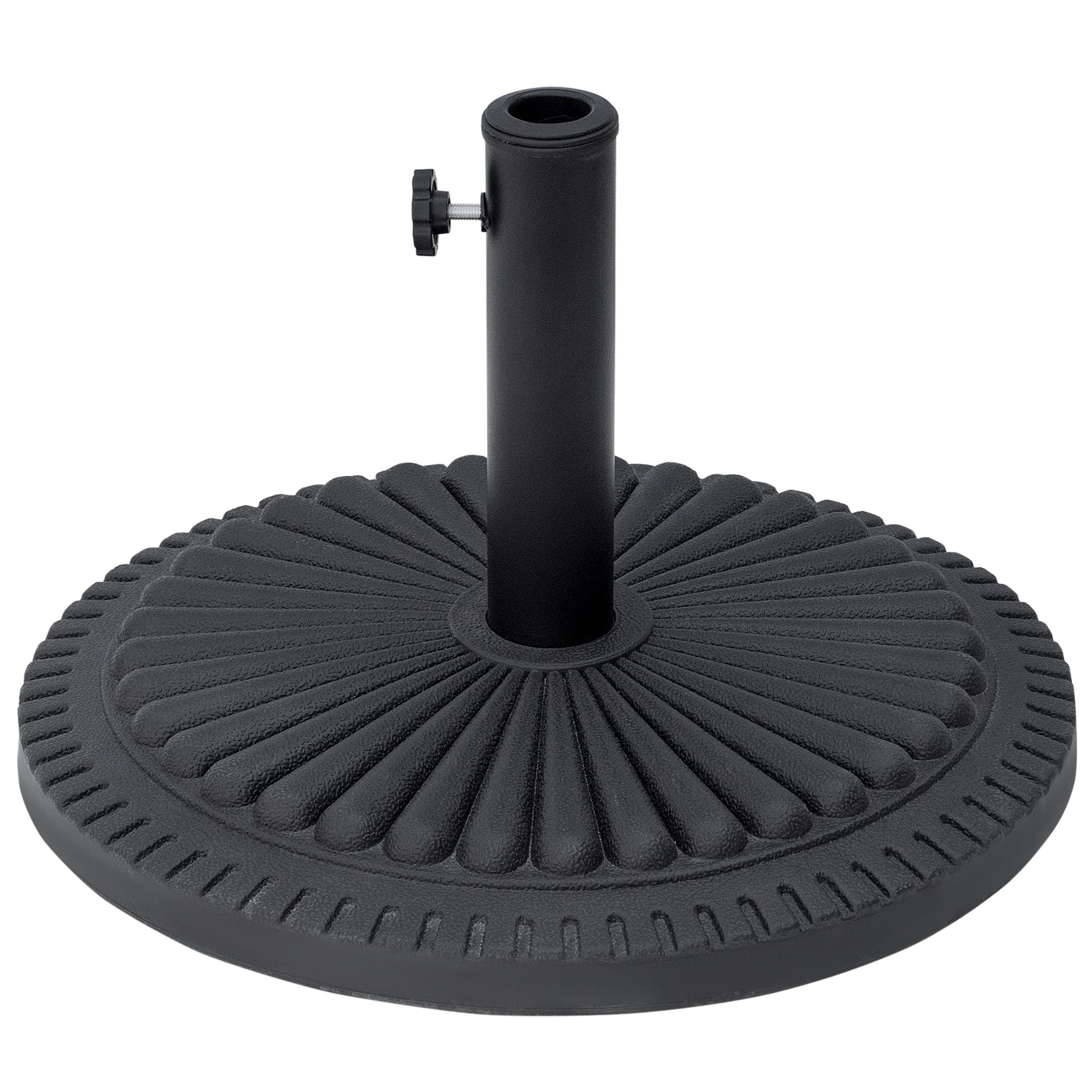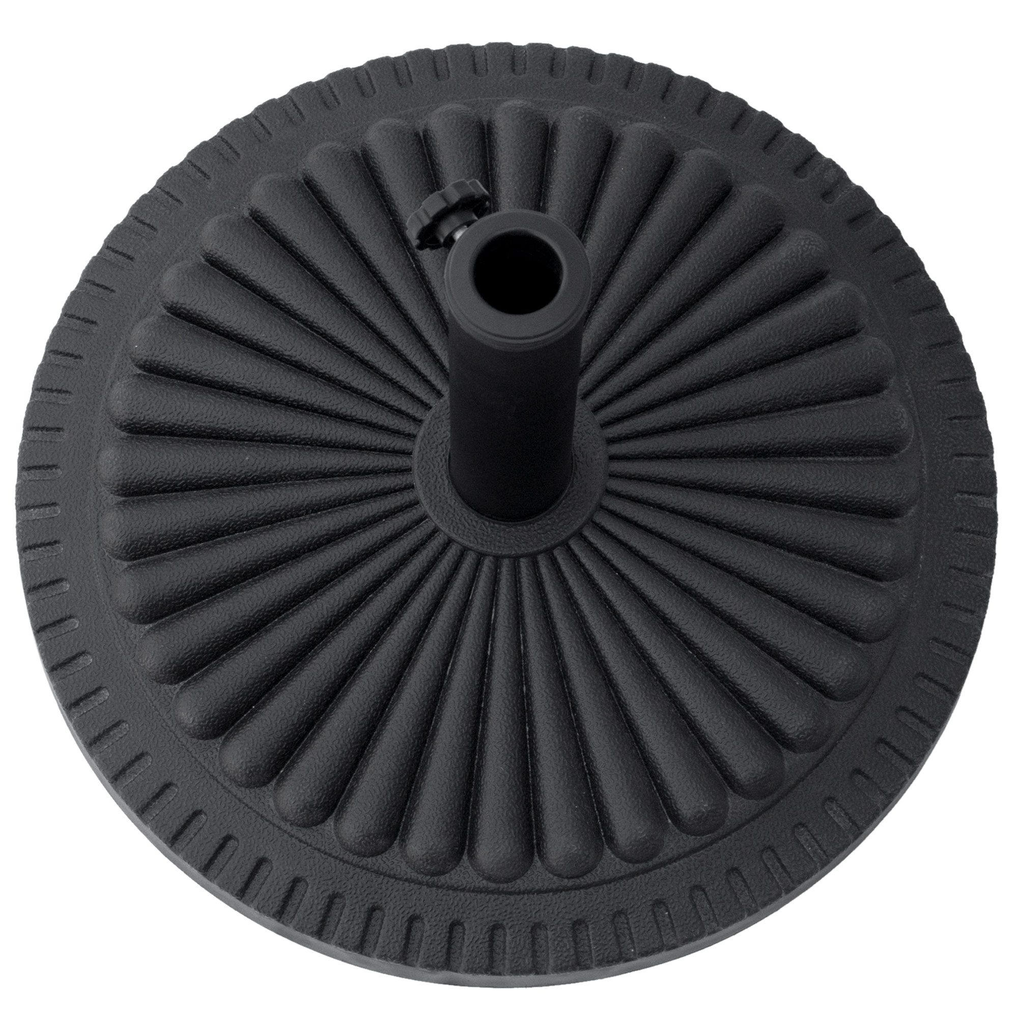 This umbrella base offers a decorative, high end touch to your outdoor living space while also performing a necessary task of holding your umbrella in place. With an attractive decorative sunburst pattern and black finish this piece adds charm and elegance to any patio. Made from poly resin, this piece is rust-resistant and made to last for years. Set up your outdoor patio today with a beautiful umbrella and keep it secure with an umbrella base.