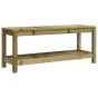 This wooden garden bench is perfect for outdoor use and is designed to be the focal point of your garden, terrace or patio, etc. Impregnated wood: Solid pine wood is a beautiful natural material. Pine wood has a straight grain, and the knots give the material its signature, rustic look. Impregnation is a preservation process that is carried out by using autoclaves. The pressure-treatment increases resistance to decay and weather.Slatted design: The slatted design of the park bench prevents water accumulation, keeping the seat dry and preventing unnecessary rotting.Wide applications: The outdoor bench is perfect for any front porch, patio, backyard, lawn, garden, etc.Practical shelf: This patio bench features a shelf, adding storage space to put some items. Good to know:To make sure your outdoor furniture stays beautiful, we recommend protecting it with a waterproof cover.