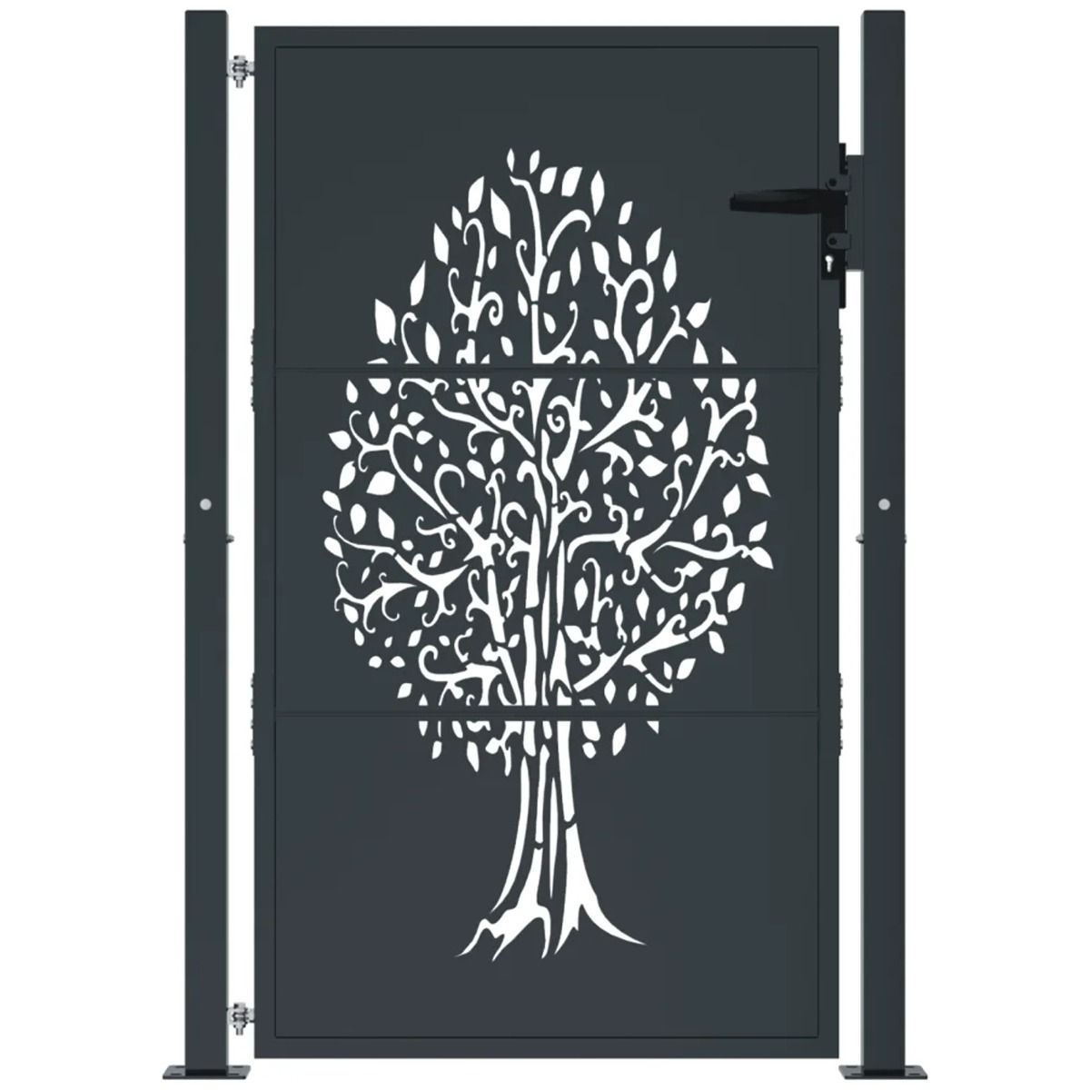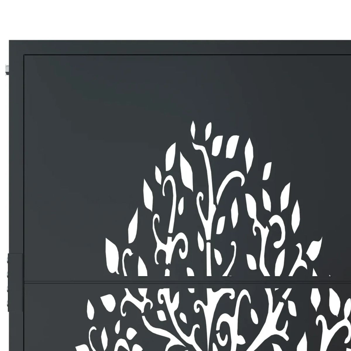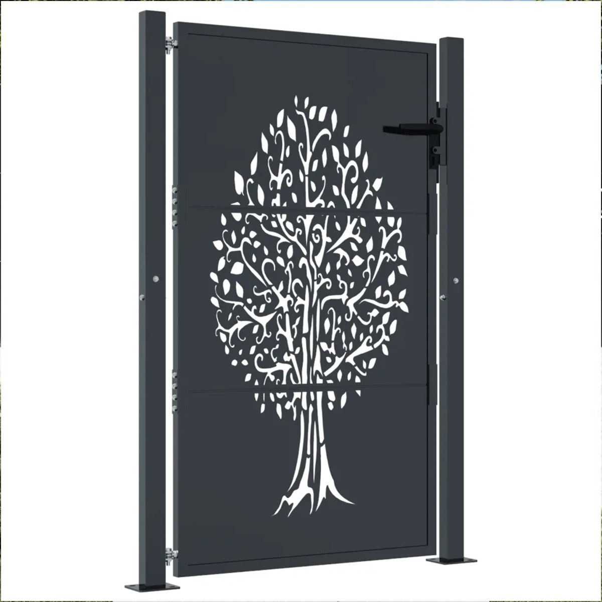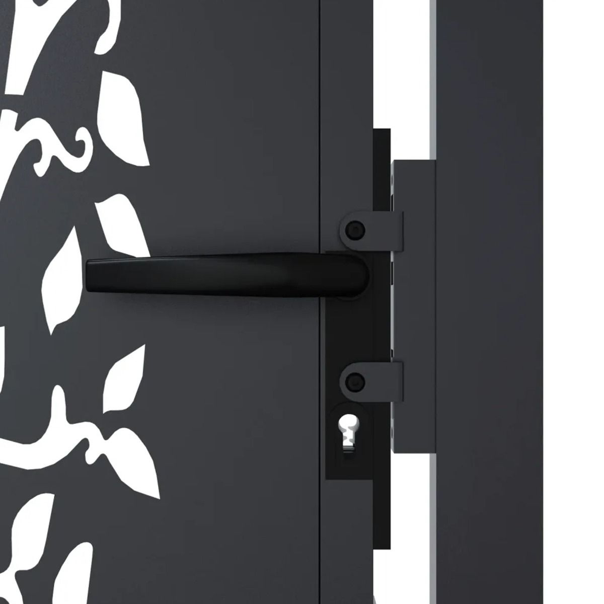 This garden gate, featuring a perfect combination of strength and elegance, makes an ideal entry point for the fence around your garden or patio. Durable material: Steel is an exceptionally hard and strong material. It offers sturdiness and stability. Galvanisation provides better protection against corrosion and is useful for products that'll be used outdoors as well as in harsh environments. And the powder coating on steel creates a protective layer against wear and tear.Laser-cut design: The security gate has a beautiful laser-cut design that adds a unique charm to your home.Lockable system: The outdoor gate is equipped with a lockable system for extra security.Easy to assemble: The entrance gate comes complete with two posts with flange plates and mounting accessories for easy installation.