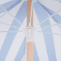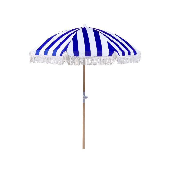 Equip your garden with this parasol to instantly refresh the area, and add a retro vibe to it. The piece, which comes in a mix of blue and white, is made out of high quality materials - its pole has been crafted out of beech wood, so it is very durable and can withstand various outdoor conditions. The umbrella will also protect you from sun, due to the tilting mechanism, and a recycled polyester top, which is UV-resistant. What is more, the parasol comes in a cover with handles, so you can easily transport or store it. Details: Color: Blue, White, Light Wood. Main material: Polyester. Additional material: Beechwood, Fibreglass. Material Composition: 100% Polyester Weight: 3.5 Assembly: Does Not Require Assembly Wood type: Fagus Sylvatica Wood Origin: France