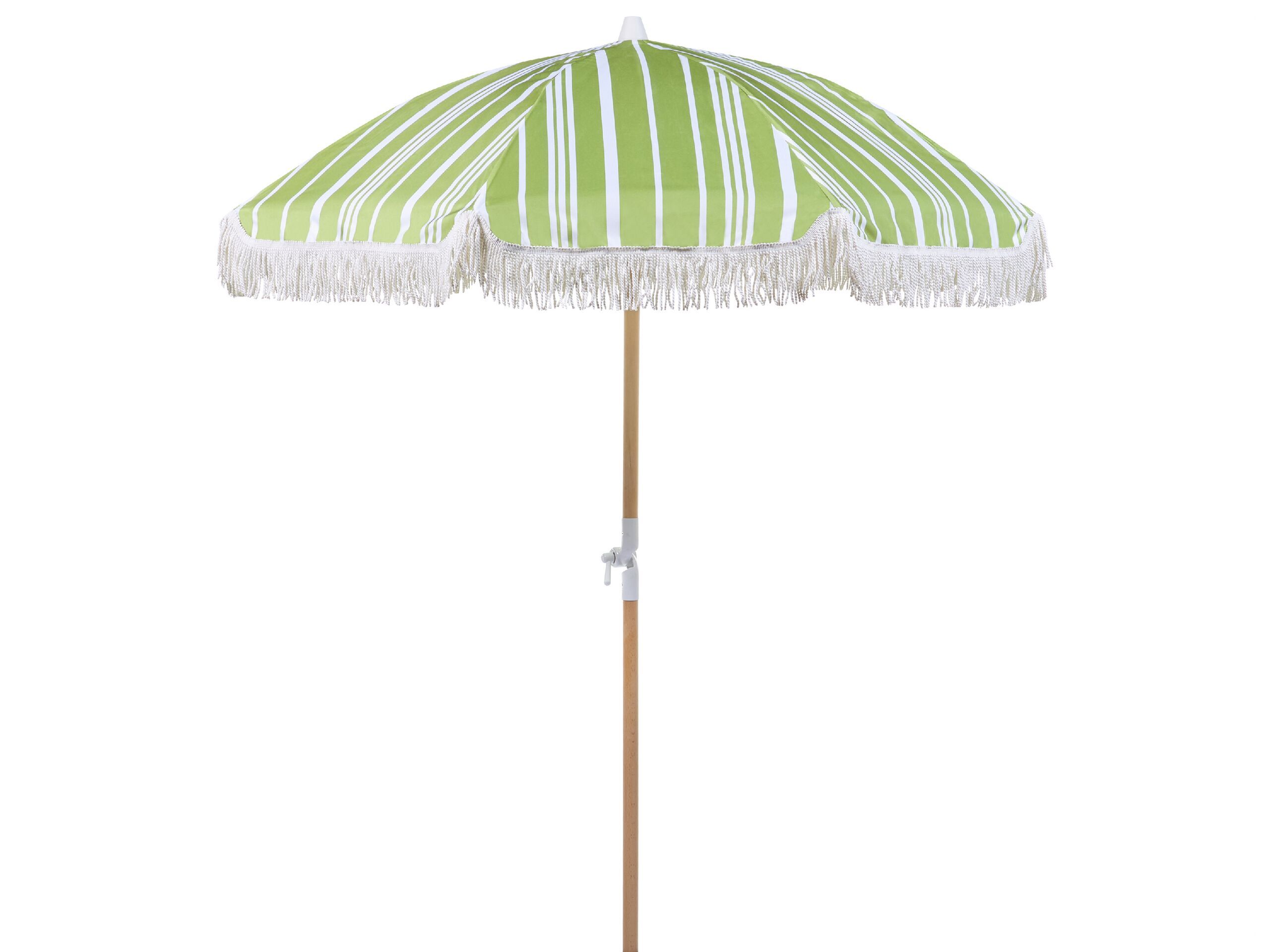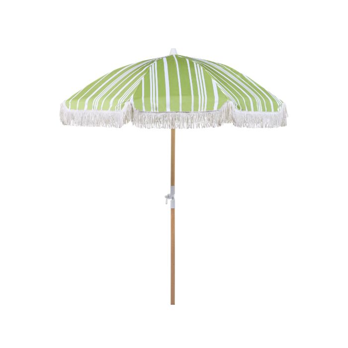 Equip your garden with this parasol to instantly refresh the area, and add a retro vibe to it. The piece, which comes in a mix of green and white, is made out of high quality materials - its pole has been crafted out of beech wood, so it is very durable and can withstand various outdoor conditions. The umbrella will also protect you from sun, due to the tilting mechanism, and a recycled polyester top, which is UV-resistant. What is more, the parasol comes in a cover with handles, so you can easily transport or store it. Details: Color: Green, White, Light Wood. Main material: Polyester. Additional material: Beechwood, Fibreglass. Material Composition: 100% Polyester Weight: 3.5 Assembly: Does Not Require Assembly Wood type: Fagus Sylvatica Wood Origin: France