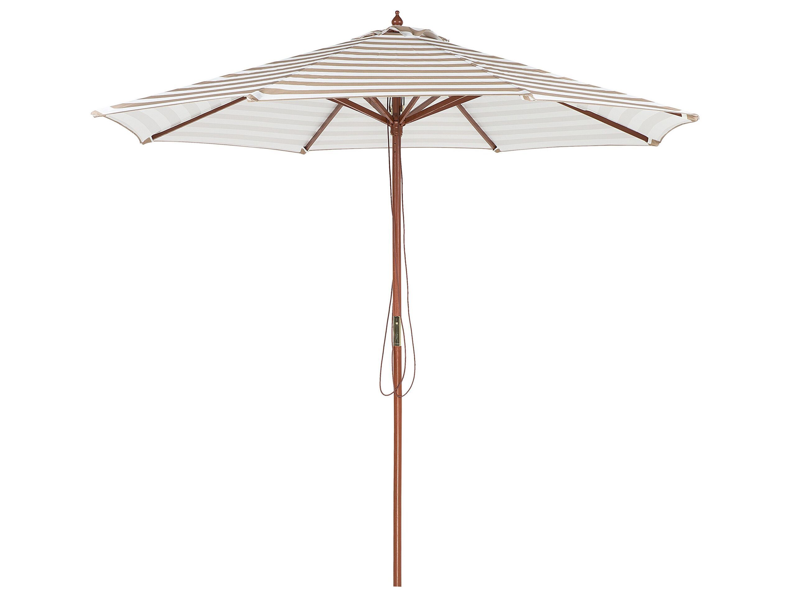 With this parasol, you can create a stylish, shady retreat on your balcony or garden, perfect to cool during hot, summer days. Designed with a steady birch wood pole and completed with a polyester canopy spread on eight wooden ribs. The striped patterning of the canopy brings effortlessly cool retro charm to any outdoor area. The parasol opens and closes easily with a string mechanism. Details: Color: White, Beige. Main material: Polyester. Additional material: Birch Wood. Material Composition: 100% Polyester Weight: 6 Assembly: Partial Assembly Required Wood type: Betula chinensis Wood Origin: China