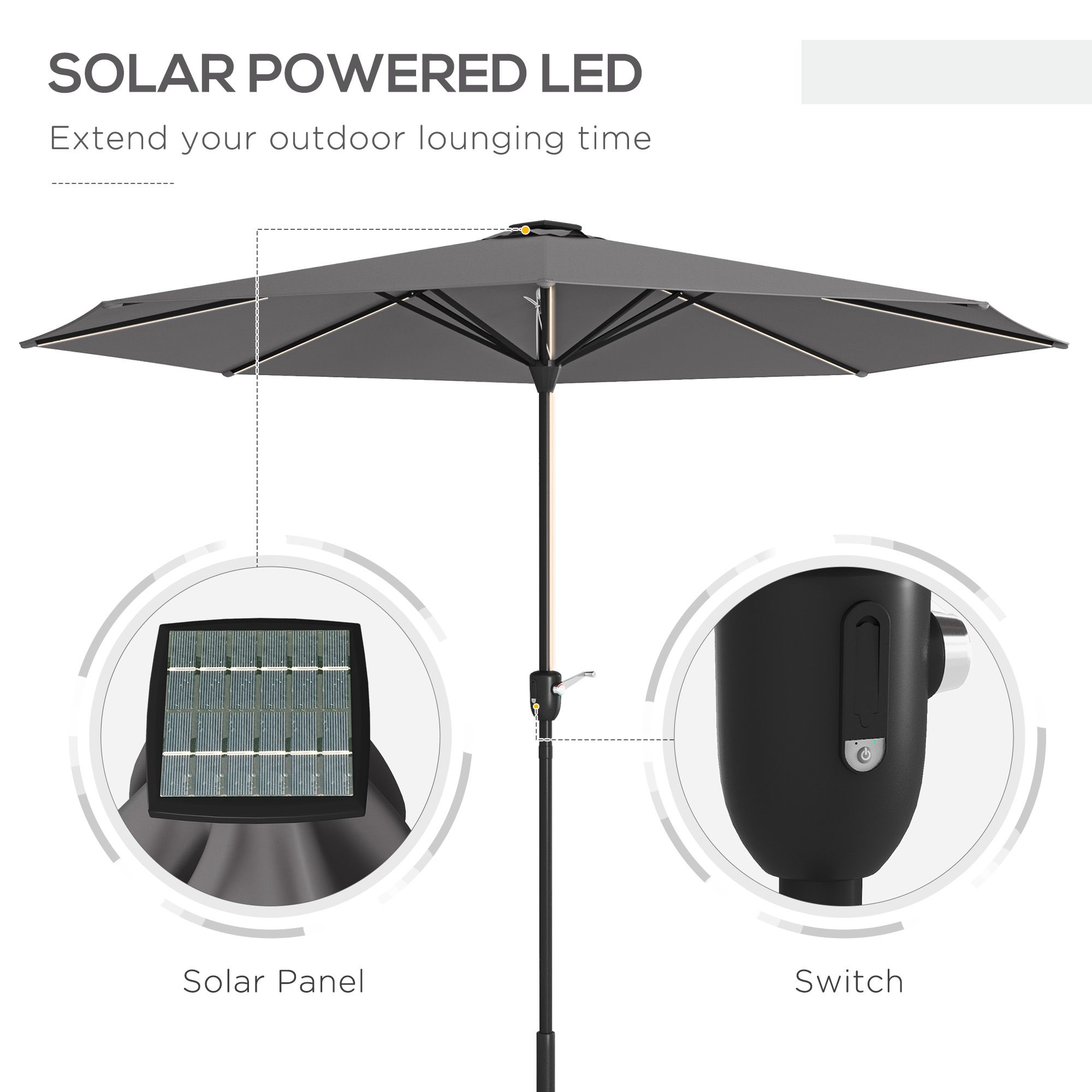 Garden Parasol with LED Lights, Solar Charged Patio Umbrella with Crank Handle, for Outdoor, Charcoal Grey