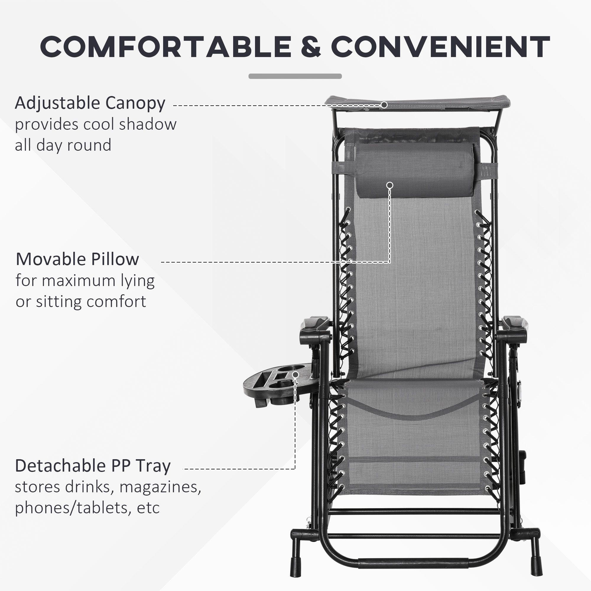 This rocking sun lounge chair from is the perfect gateway to total relaxation in the sun. The powder-coated steel frame forms a tough structure, where the seat is attached to the base for a floating zero-gravity feel. The back freely adjusts between a 10°-35° angle so you can lie back to a position you like. The fabric seat and padded headrest make it comfortable, finished with a handy side tray and top canopy to shield you safely.