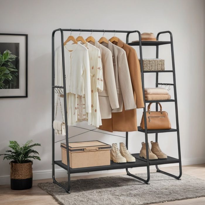 Garment Rack - ZARNIA Shoe Shelf 5 Tier Storage 6 Side Hook - Ebony Black