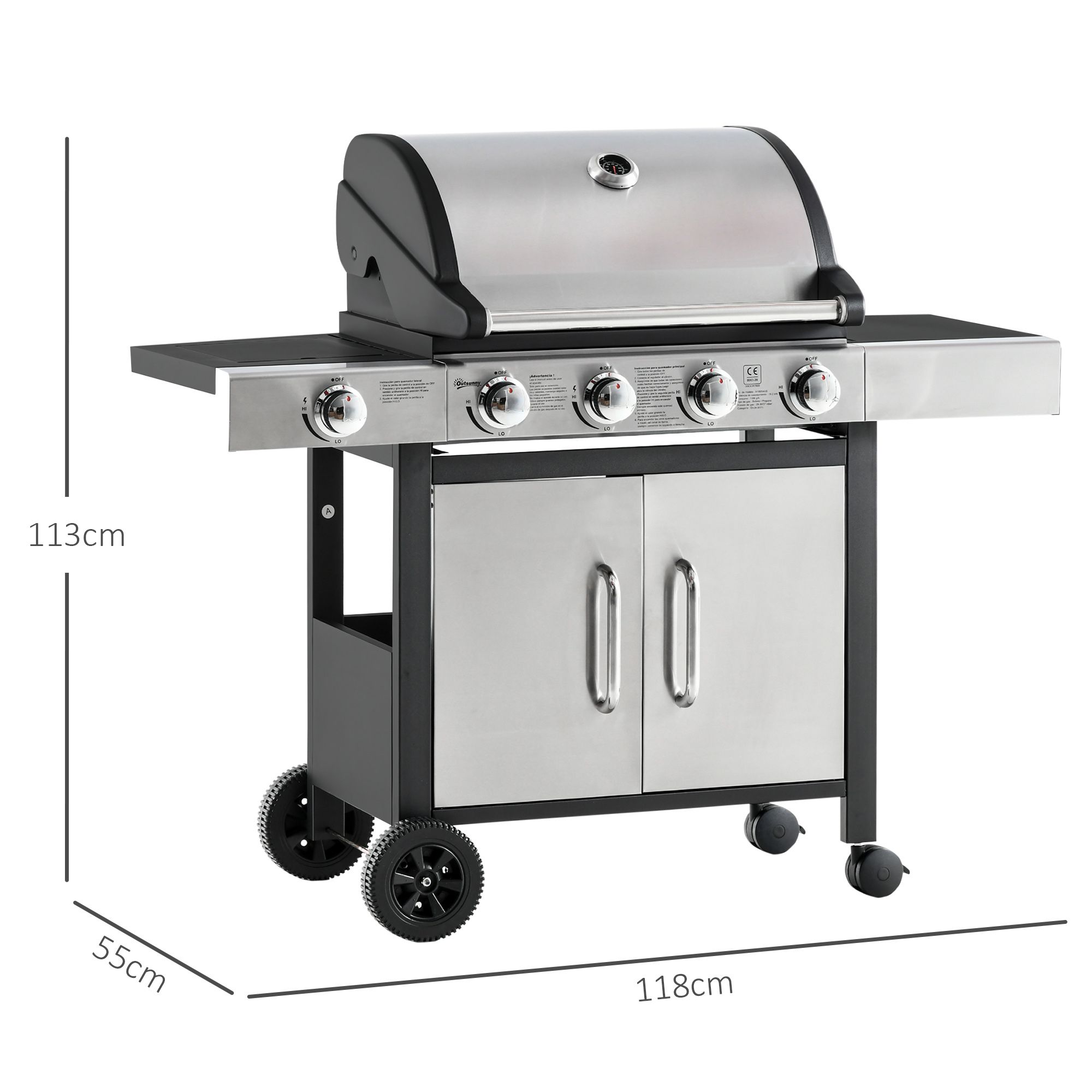 Gas Burner Barbecue Grill 4+1 Burner Garden BBQ Trolley w/ Side Burner Warming Rack Side Shelves Storage Cabinet Piezo Ignition Thermometer