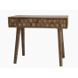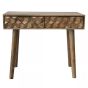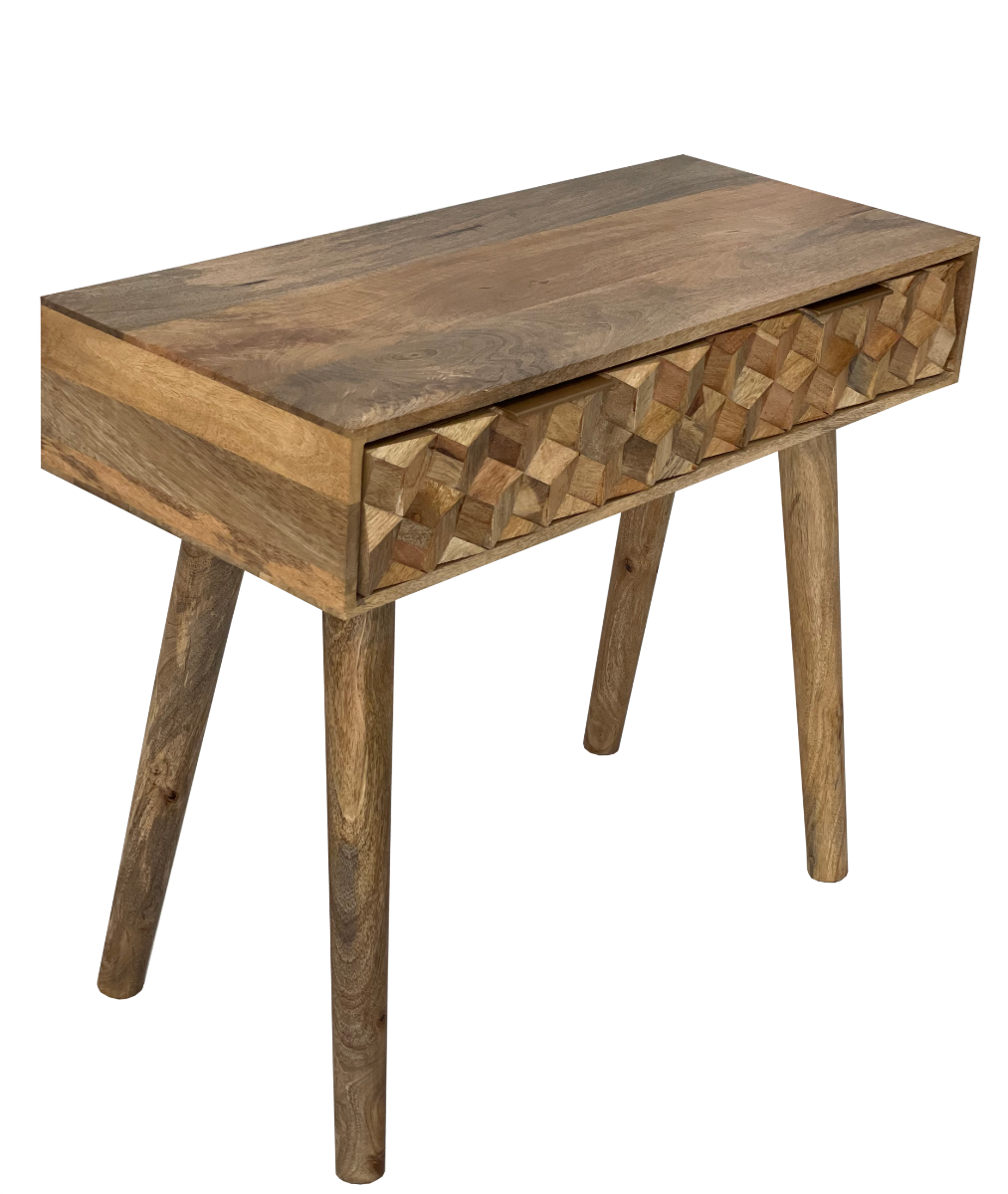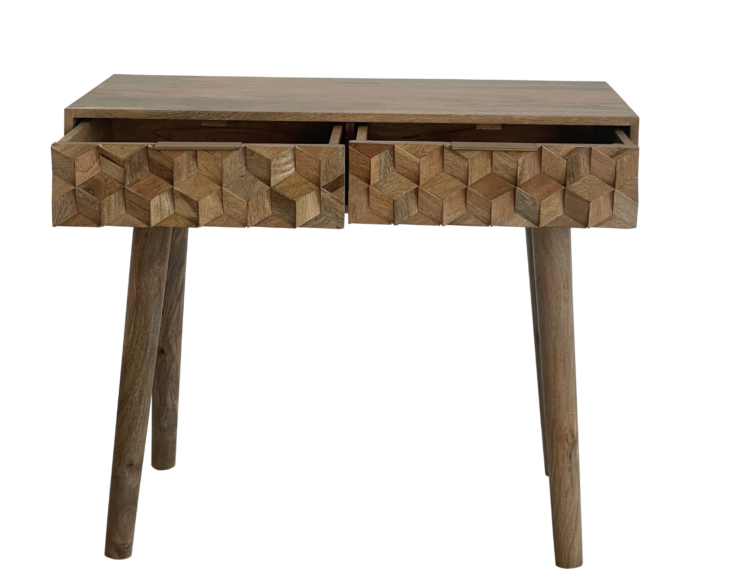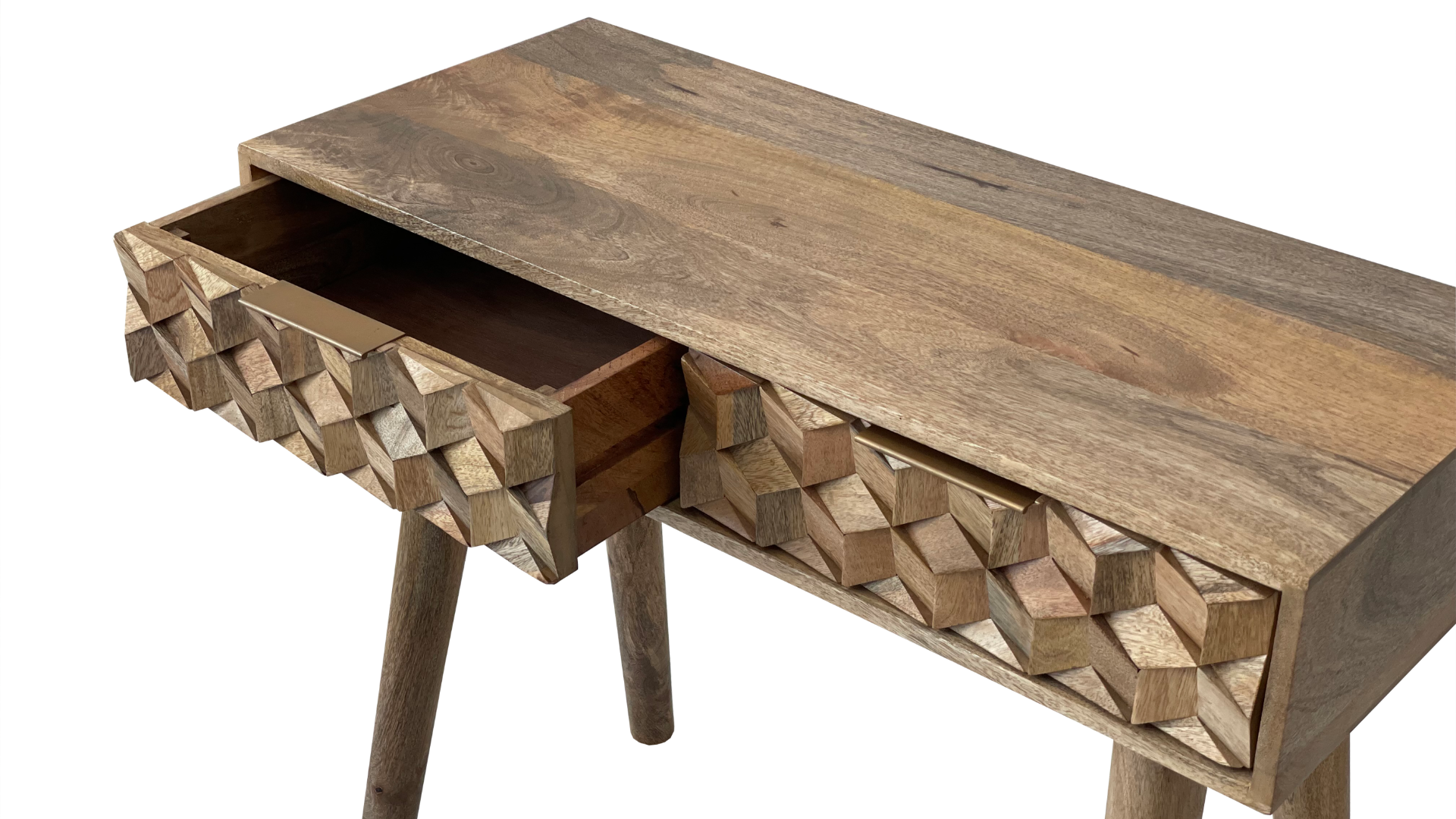 This Geometric Console Table 2 Drawer will be the perfect addition to your living space. Crafted by hand with solid mango wood, this table features a light colour finish and Scandinavian style legs for a modern look. The geometric block pattern on the drawer fronts adds character and sleekness to any room or hallway. Not only does it make a stylish statement, but also provides you with extra storage space that can hold all of your essentials.