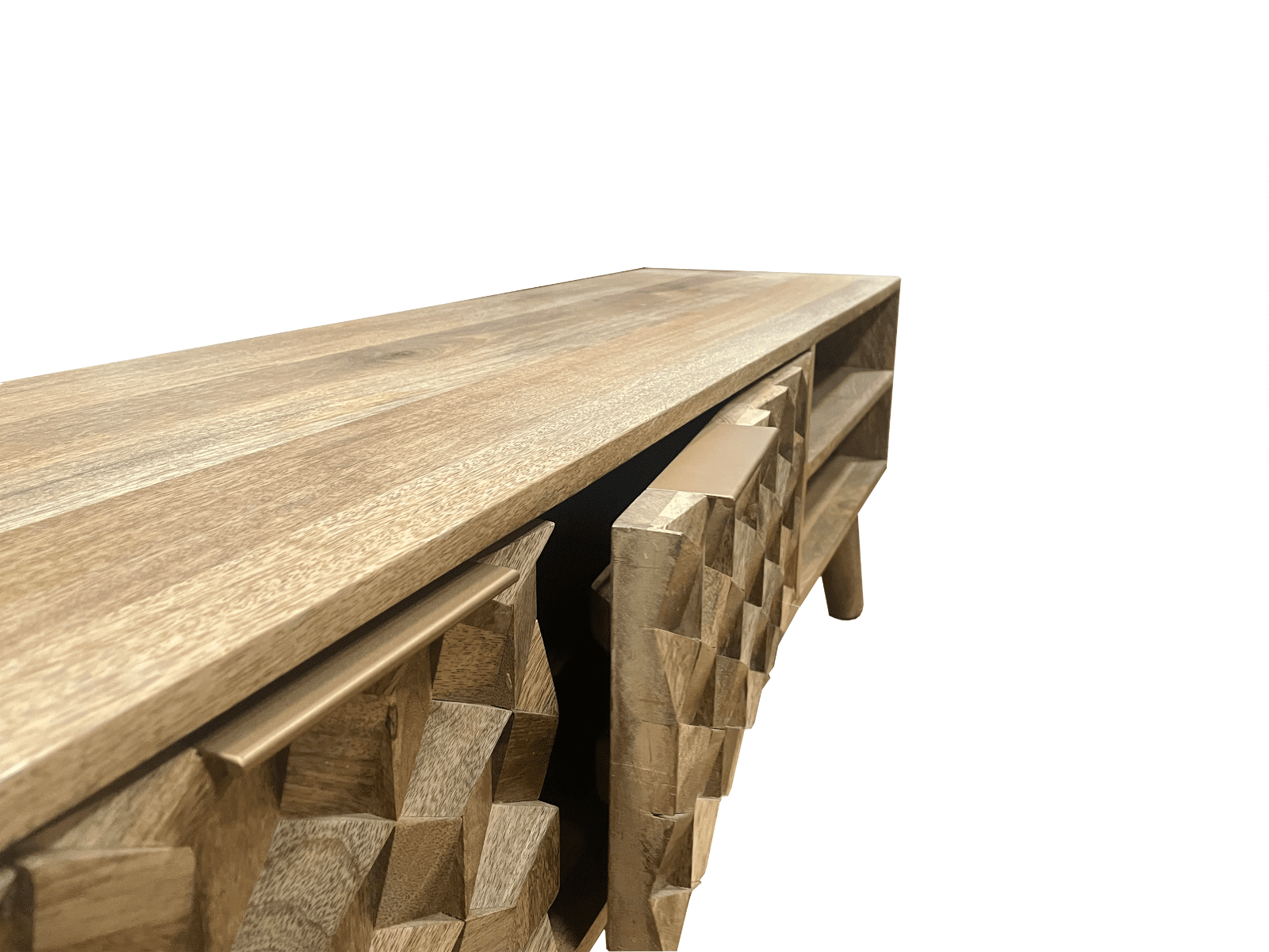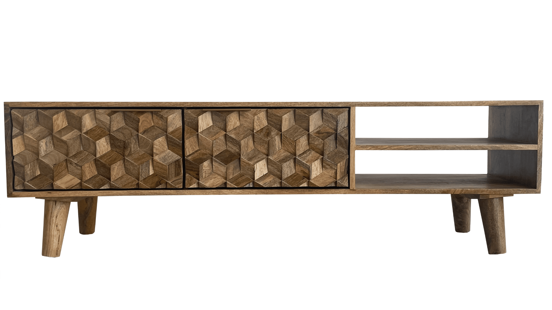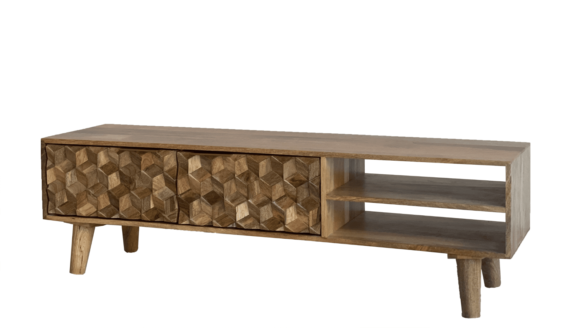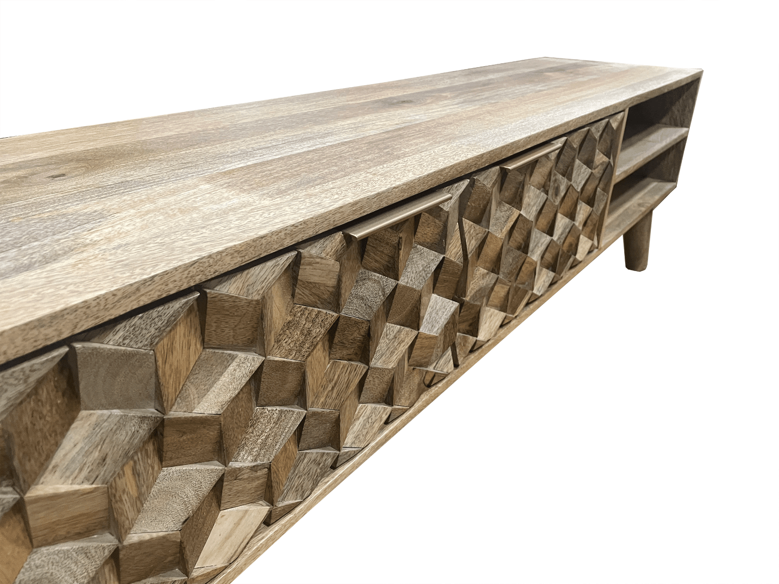 Transform your living space with the contemporary and stylish Geometric Media TV Unit 140cm. Crafted from 100% solid mango wood, this sustainable piece is hand-finished in a light colour for a touch of modern Scandi style. It features striking geometric block pattern front doors and two sattelite shelves for maximum storage, perfect for any home or office.