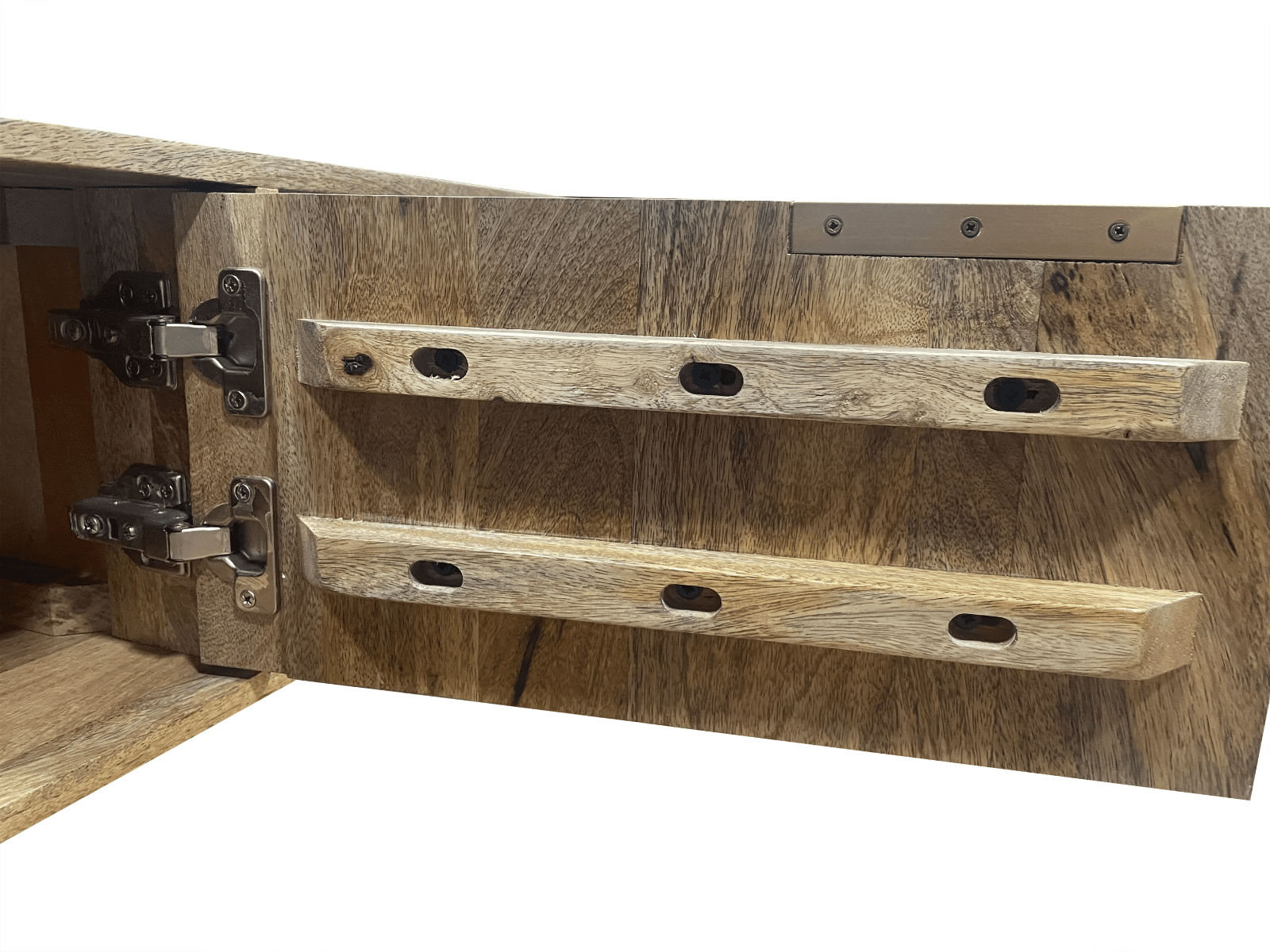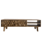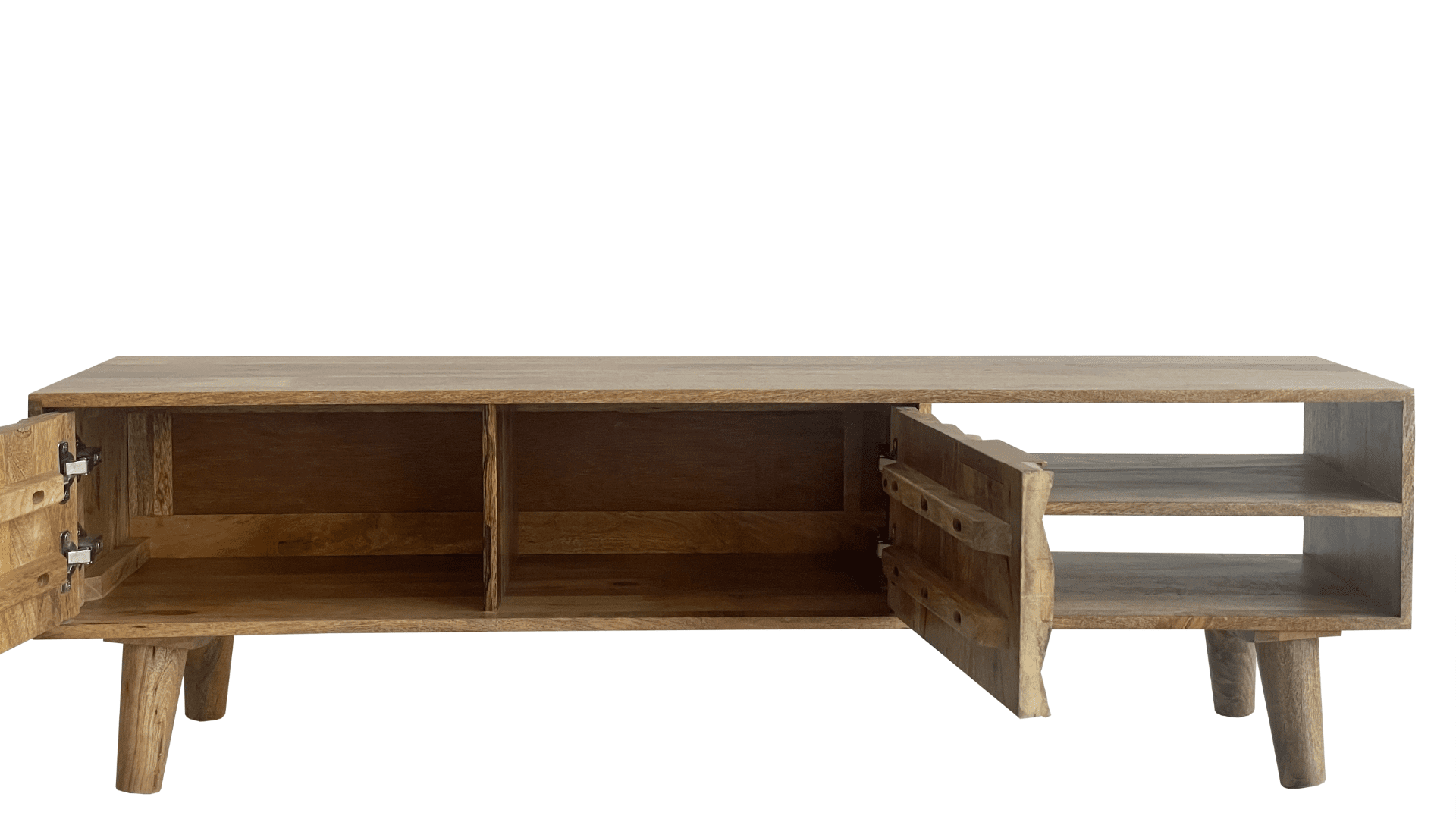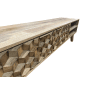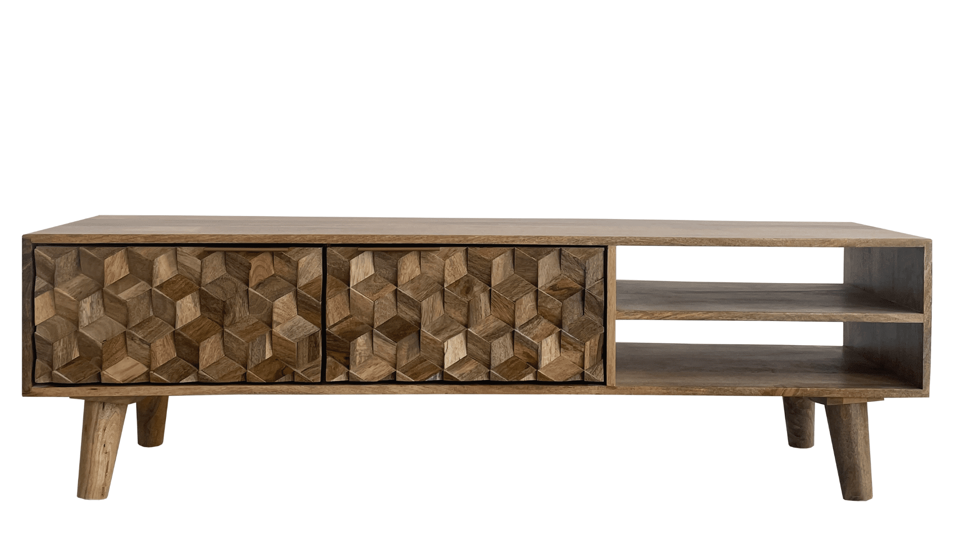Transform your living space with the contemporary and stylish Geometric Media TV Unit 140cm. Crafted from 100% solid mango wood, this sustainable piece is hand-finished in a light colour for a touch of modern Scandi style. It features striking geometric block pattern front doors and two sattelite shelves for maximum storage, perfect for any home or office.