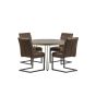 This elegant round dining table will add a touch of style to your dining room, while comfortably seating 4 people. The table top is stained in a dark walnut finish, featuring gold metal inlays and a matching frame on the edge of the table top, complemented by gold metal legs.