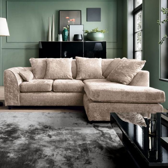 Upholstered in a sumptuous crushed chenille - a fuzzy cotton yarn of fabric that has pile protruding around the weave creating a caterpillar look. This luxuriously comfortable sofa features foam-filled seats, whilst the corner chaise section is the perfect place to put your feet up. Complete with seven cosy fibre-filled scatter cushions, this stunning compact corner sofa would be a great addition to any modern home. Bring a touch of glamour to your home with the Gilliver collection. All sections in the modular Gilliver sofa series can be used freestanding or put together into exactly the combination you need.