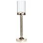 The elegant candle holder is a decoration that will highlight your interior and make it sparkle. Crafted from glossy metal, the piece comes with a glass shade and a pillar base, filled with crushed, shiny elements that look like zirconia. Match it with a grey, black or white candle which flame will bring a warm, cosy atmosphere into any bedroom or living room. The slender pillar candle holder will also be a perfect decoration of your dining room table, whether for Christmas, romantic dinners or other special occasions. Details: Color: Gold. Main material: Metal. Weight: 1 Assembly: Does Not Require Assembly