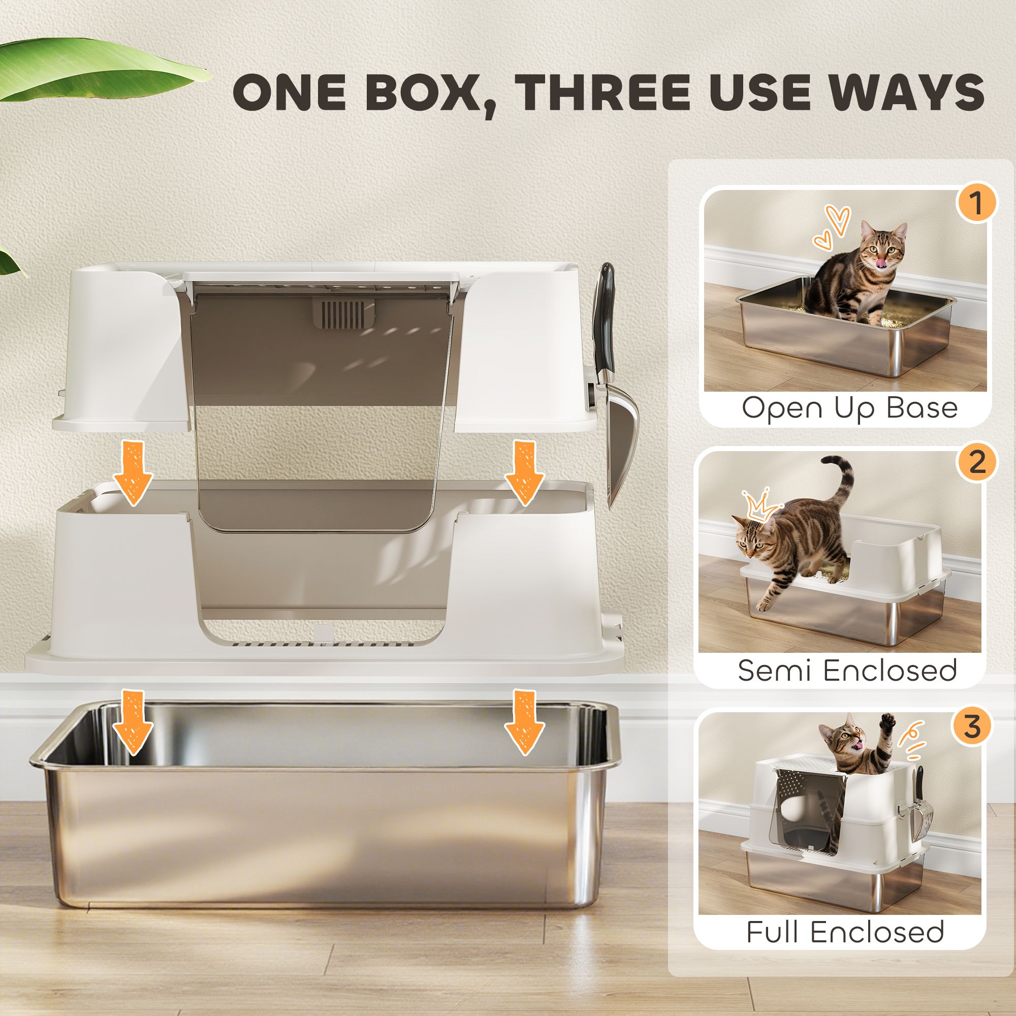 Robust material: built from 201 stainless steel, this stainless steel litter box resists odours and bacteria, keeping your cat's space fresh and hygienic for effortless daily care. 3 use ways: easily switch your cat litter box between open, semi-enclosed, or fully enclosed styles in 5 minutes, adapting to your cat's needs for a stress-free litter box. Effortlessly clean: the litter box top lid opens 100° wide for easy cleaning and the included stainless steel scoop helps prevent litter sticking, making cleaning quick and simple everyday. Extra-large space: measuring 60. 5 H cm, this large litter box suits multi-cat homes or larger breeds up to 7 kg, giving pets plenty of room and reducing the need for frequent litter changes. Dual entry flexibility: with side and top entry options with filter panel, this stainless steel litter box helps contain litter, odours and dust, keeping your home tidier and fresher with less effort