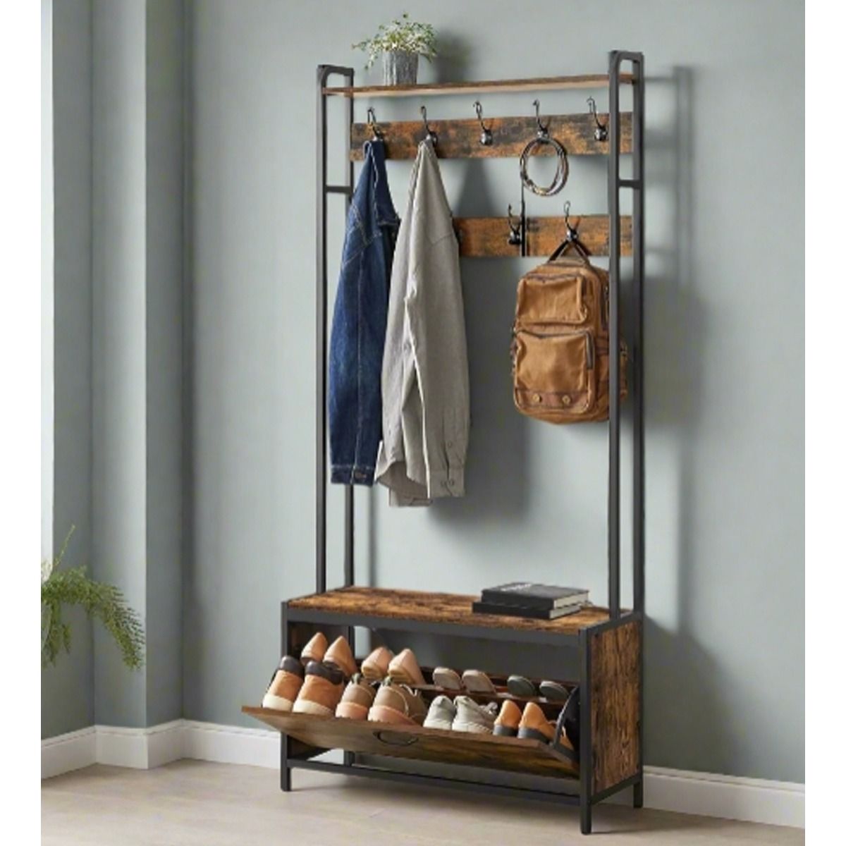 GRALVEN Coat Stand Coat Rack with Bench, Shoe Storage and Hooks - Rustic Brown
