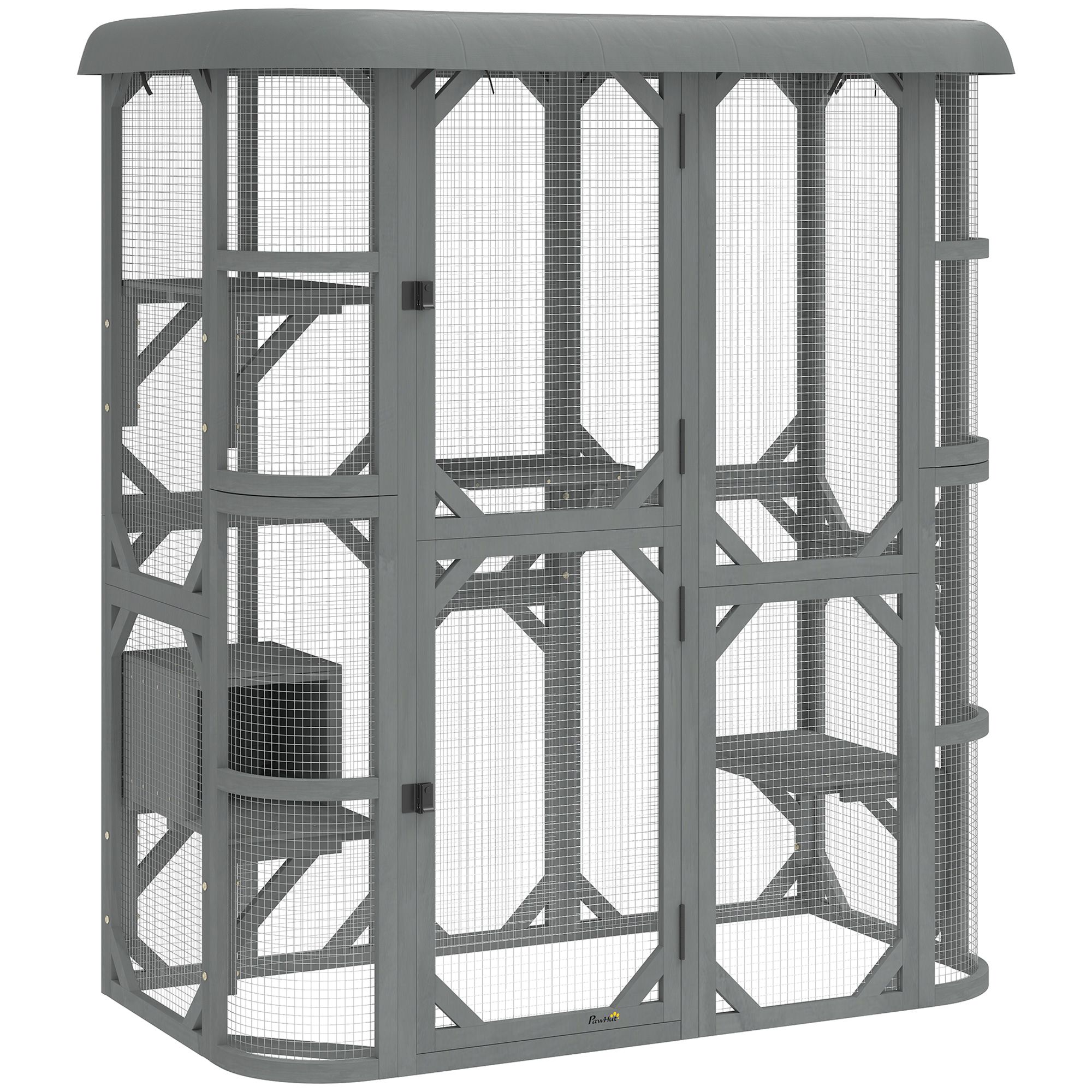 Multi-level cat paradise: four platforms and a private cat condo create a harmonious space. This catio offers plenty of room for multiple cats to climb, play and rest without feeling crowded or competing for spots. Walk-in accessibility: a full-size 170 cm tall door allows you to step inside this outdoor cat enclosure upright. Easily clean, add toys, or share a moment with your cats without bending over, making daily interaction a simple pleasure. Extended cat cage from window: give your cats their own outdoor spot to relax and enjoy the breeze. The wire-mesh back makes it easy to diy a window setup, so they can come and go freely from their favourite indoor perch. Enjoy fresh air, rain or shine: the mesh wire allows breezes flow while keeping cats secure inside the cat enclosure and the waterproof oxford canopy shields from sun and rain, so your pets stay comfy, secure and weather-ready outdoors. Stable construction: crafted from solid fir wood