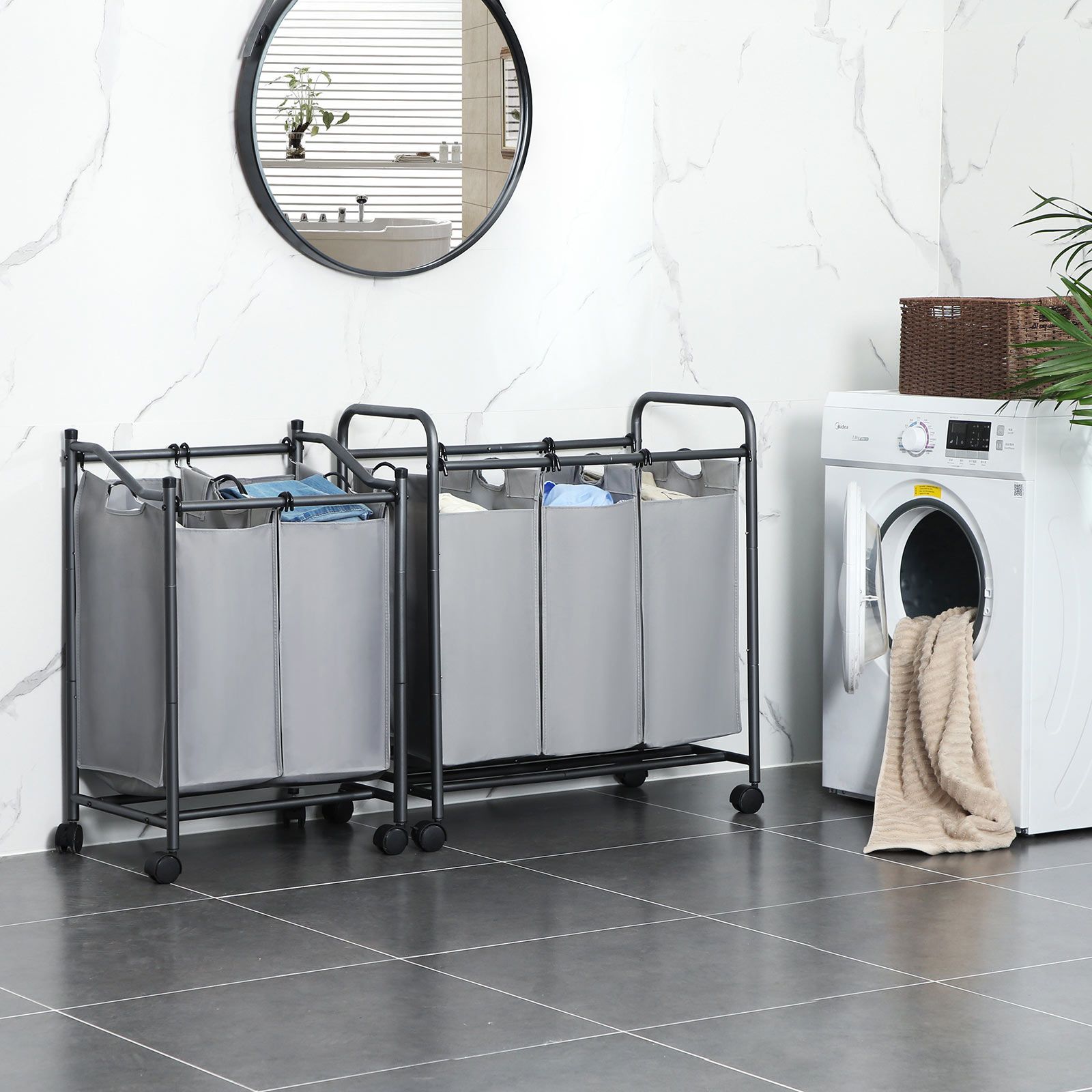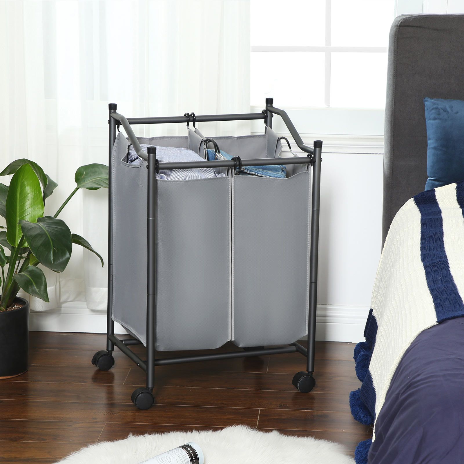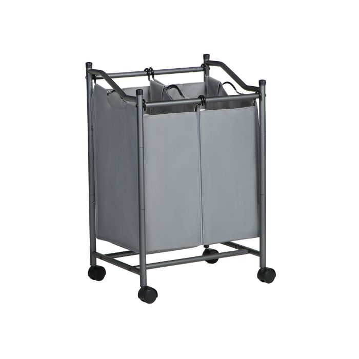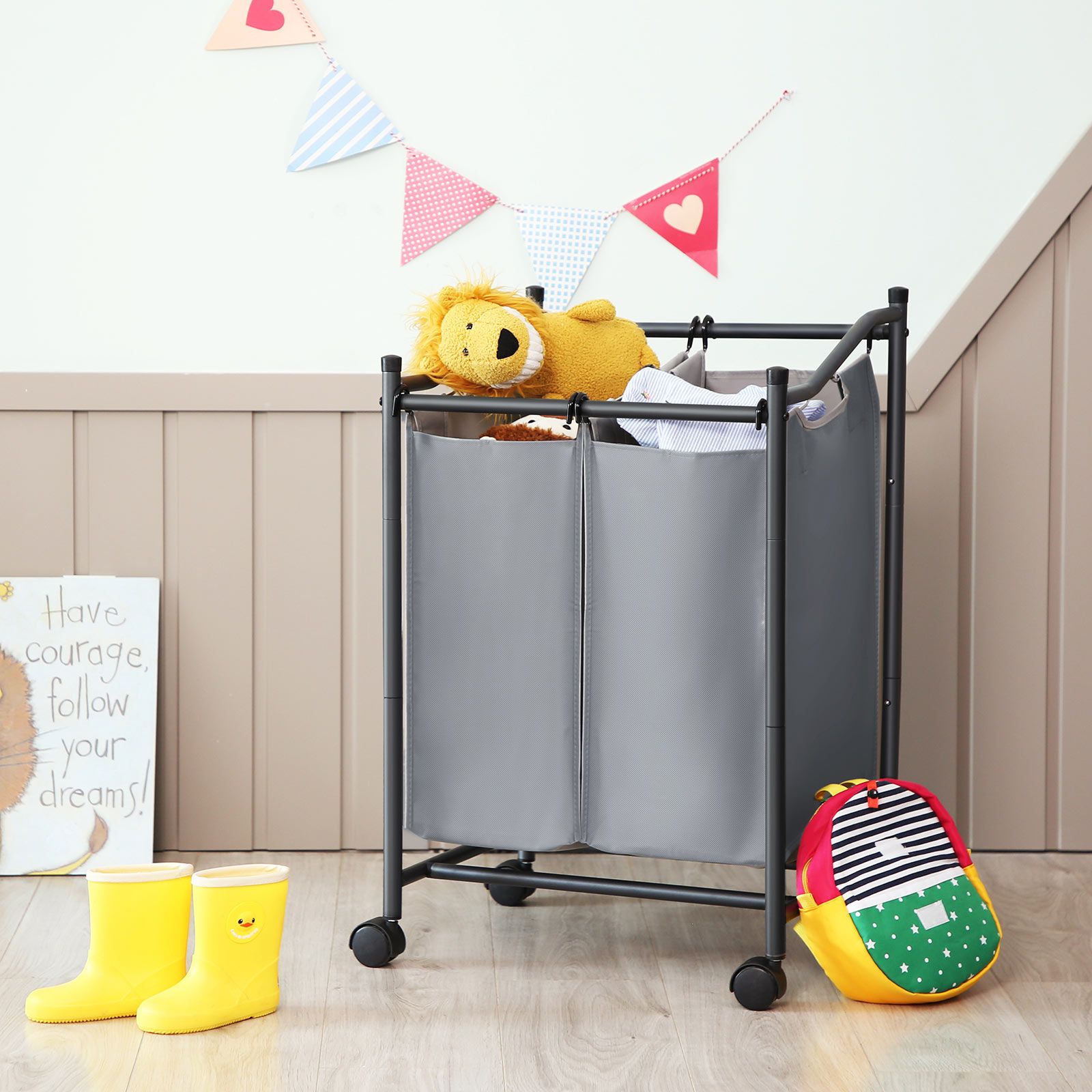 What can be expected from this rolling laundry sorter?High Quality: Made of strong powder-coated metal tubes and durable 600D high-density polyester, the laundry trolley is built to last for years to come. Plus, the laundry bags have passed the TUV test (NO. 1160038907a-001) with no harmful gas.Rolling and Collecting: 4 heavy-duty castors are provided so you can roll this cart from room to room when it's time to gather clothes, blankets, bed sheets and kids' toys, etc.Sort Your Laundry: Featuring 2 separate bags, you will no longer worry about darks and lights getting mixed up, or sweaty gym clothes mixing with delicates.With this laundry cart, your laundry day will be a breeze from now on.Specification:Colour: GreyMaterial: Power Coated Steel Tube, 600D Polyester Fiber Bag, Nylon Castor