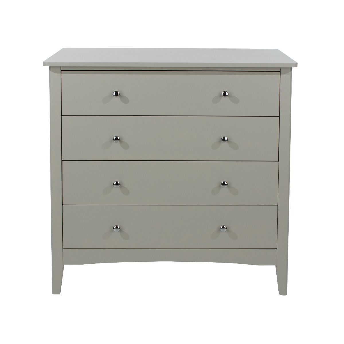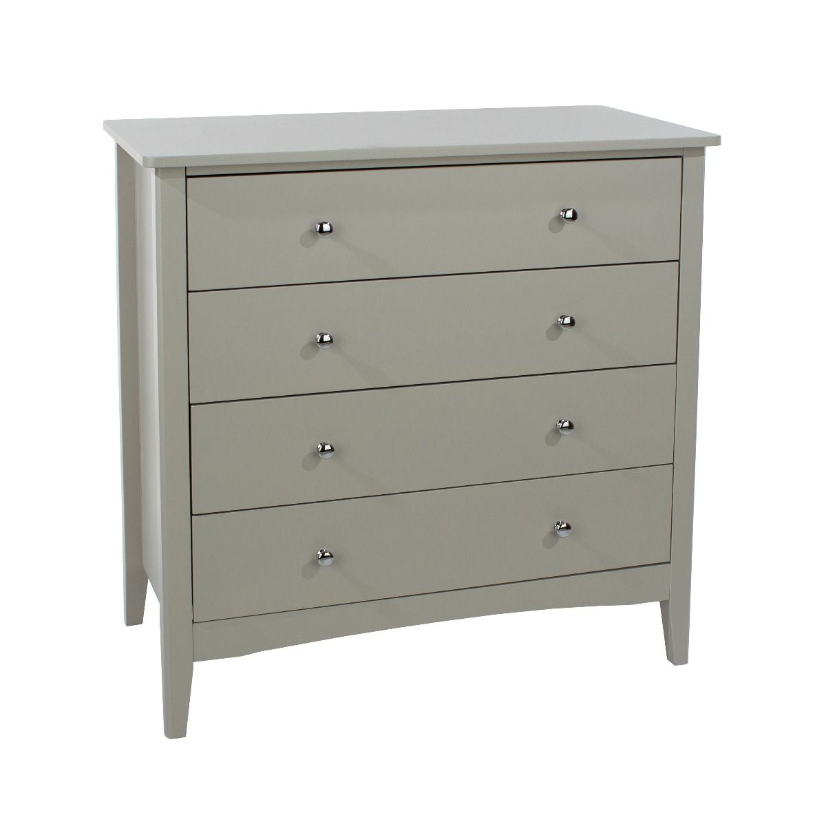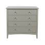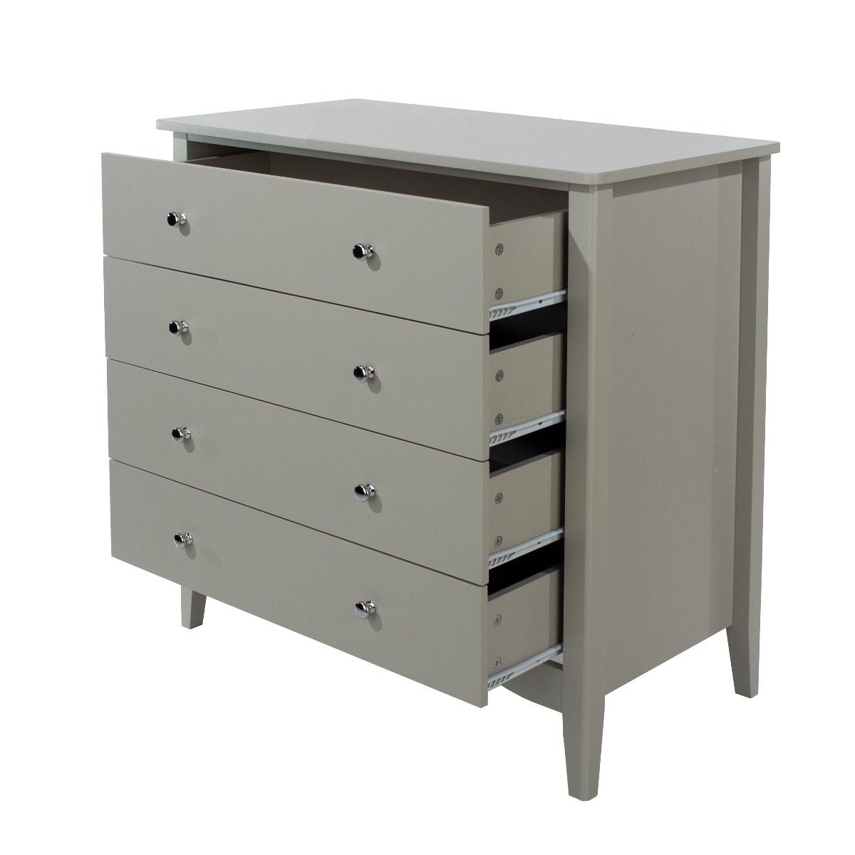 This 4 drawer chest features a soft grey paint finish, complimented with tapered legs, real metal handles and easy glide drawers