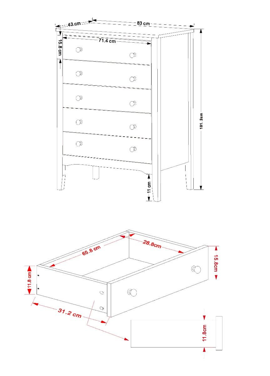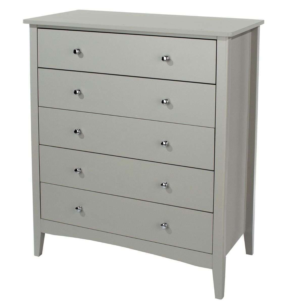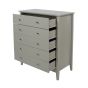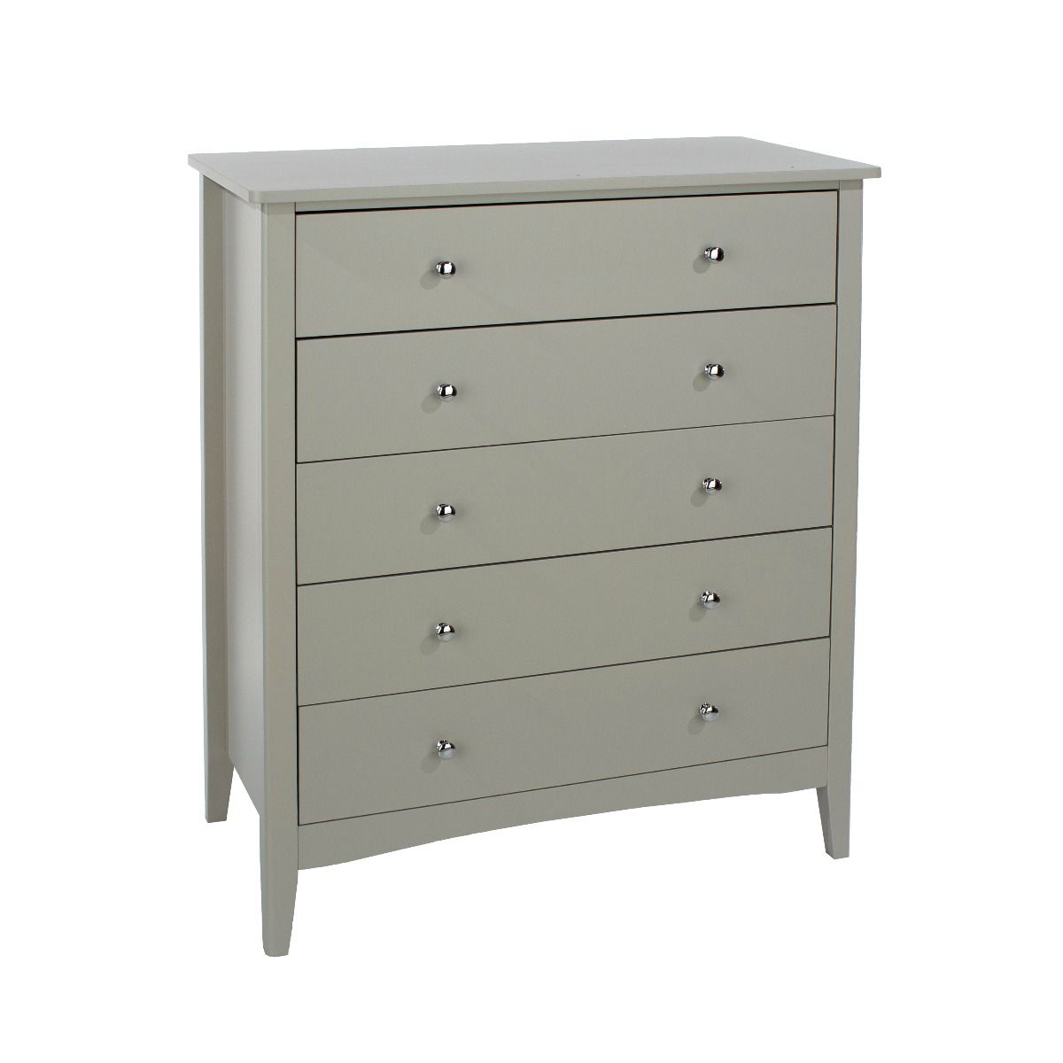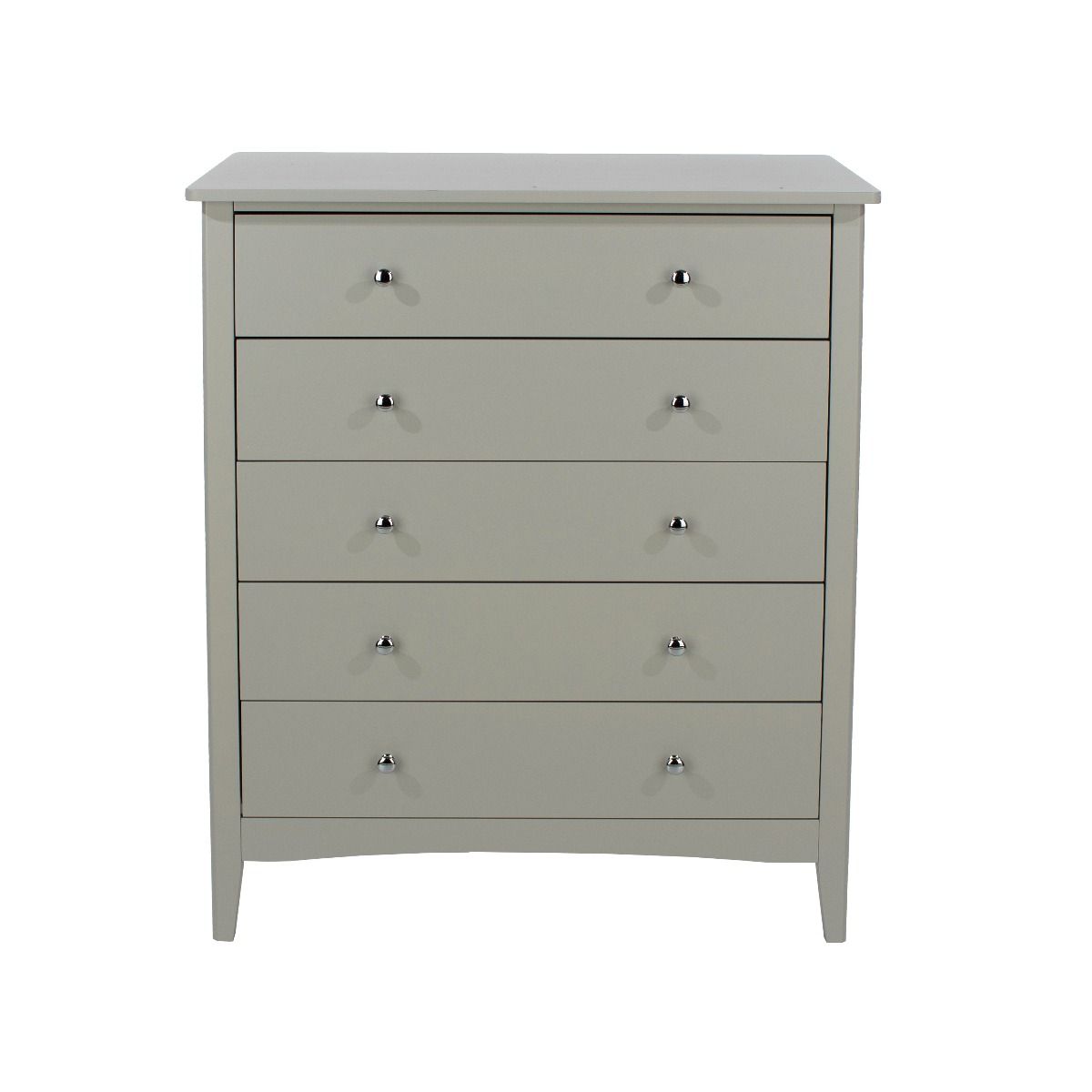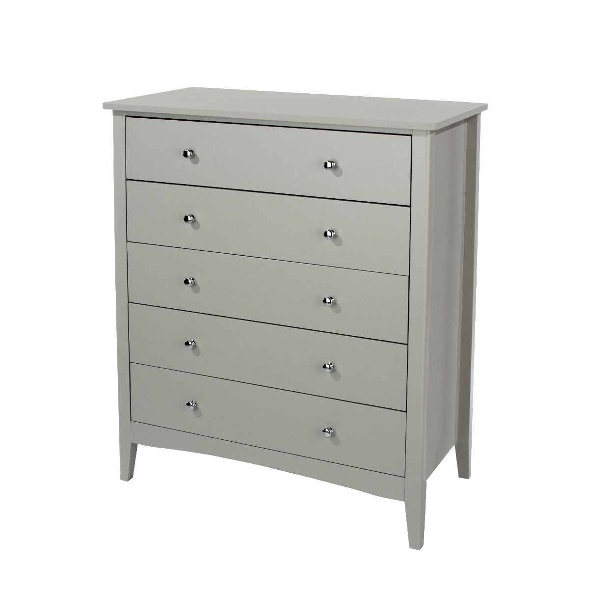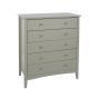 This 5 drawer chest features a soft grey paint finish, complimented with tapered legs, real metal handles and easy glide drawers