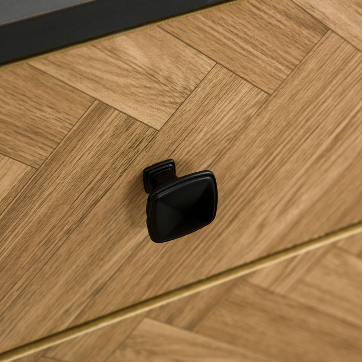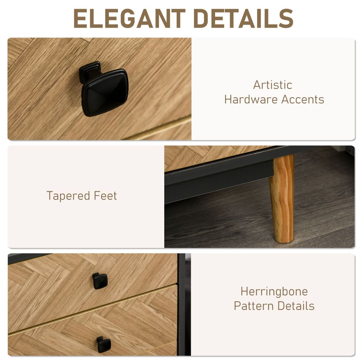 The drawer cabinet, Bold light-dark contrast, unique herringbone pattern on five drawers, elegant tapered feet and coordinating square hardware accents fit most modern or traditional setting. 5 easy-glide drawers provides ample space for blankets, clothing and other items. Crafted of solid E1 particleboard and pine wood legs, It is a durable and attractive addition to living or bedroom space.