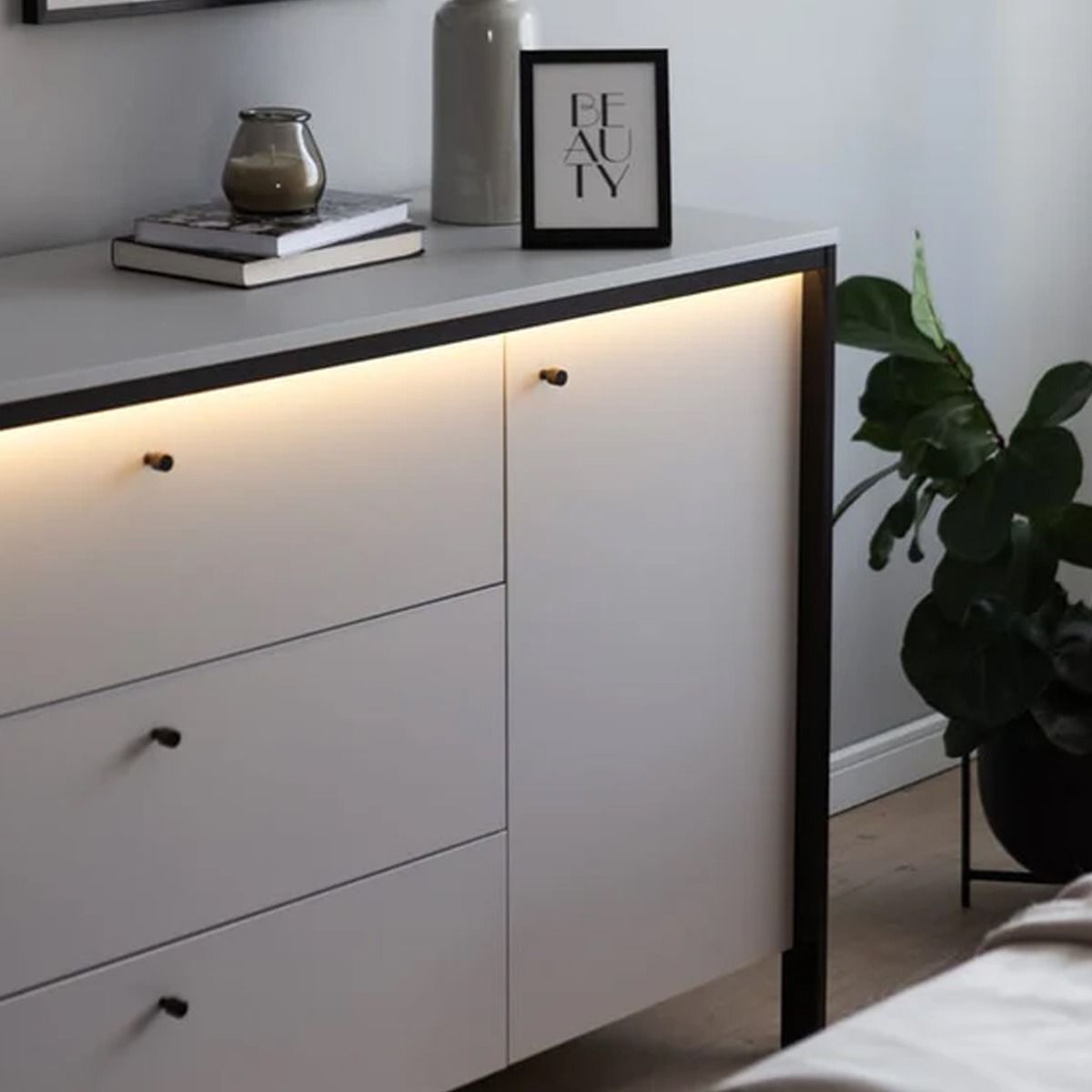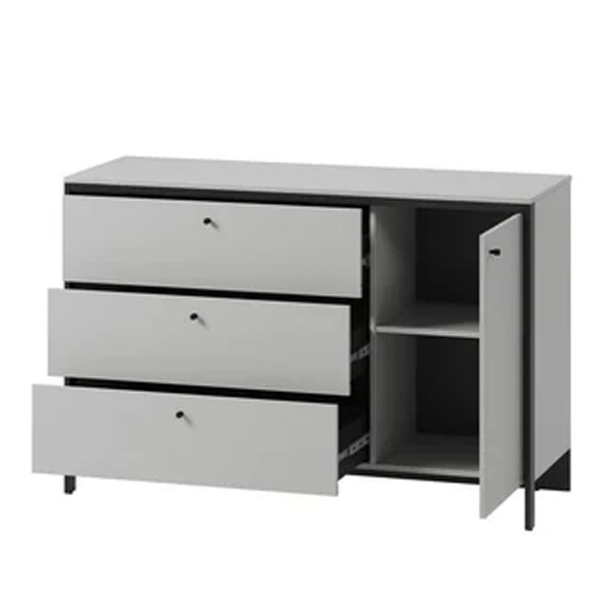 The Stark Chest of Drawers is a stylish and functional addition to any modern bedroom, measuring 136cm in width. Available in elegant grey and sleek black, this chest features one hinged door, one shelf, and three spacious drawers, providing ample storage for clothing and accessories. The integrated LED lighting enhances visibility and adds a contemporary touch to the design. Crafted from 16mm high-quality laminated board, the Stark Chest is both durable and aesthetically pleasing. Assembly is required, and matching furniture pieces are available to create a cohesive look in your space.