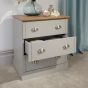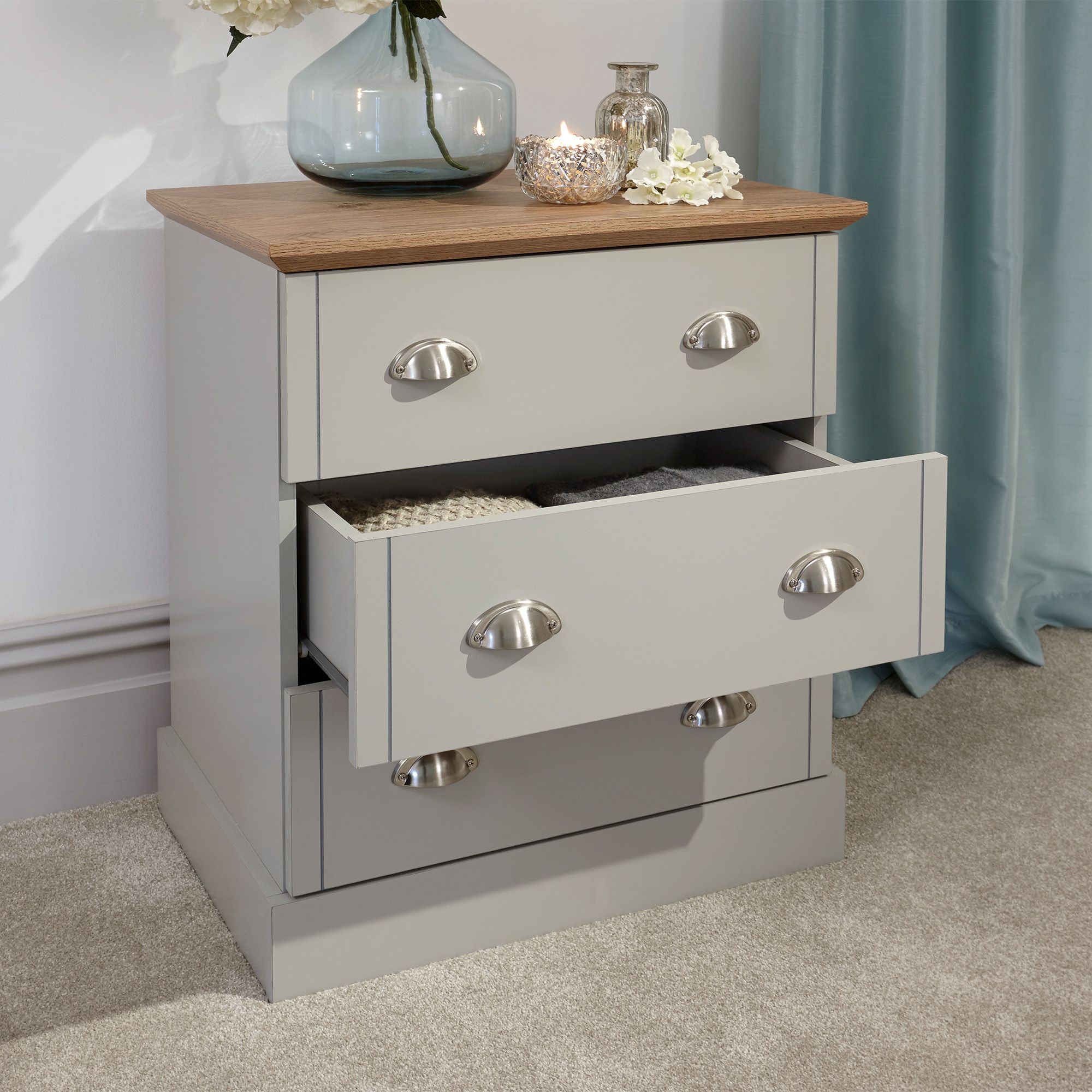 Add some classic country cottage storage to your bedroom with this superb-quality Kendal drawer set. The sturdy frame incorporates three evenly matched drawers that each feature a pair of brushed steel cup handles for ease of use. Mounted on a deep base plinth, the soft grey finish contrasts perfectly with the bevelled oak-effect top that is ideal for displaying ornaments and accessories.