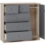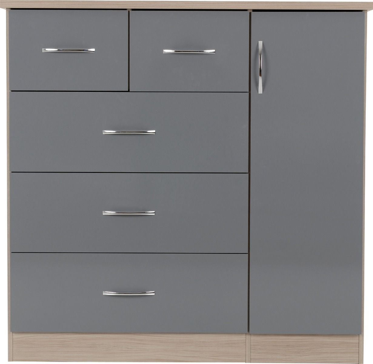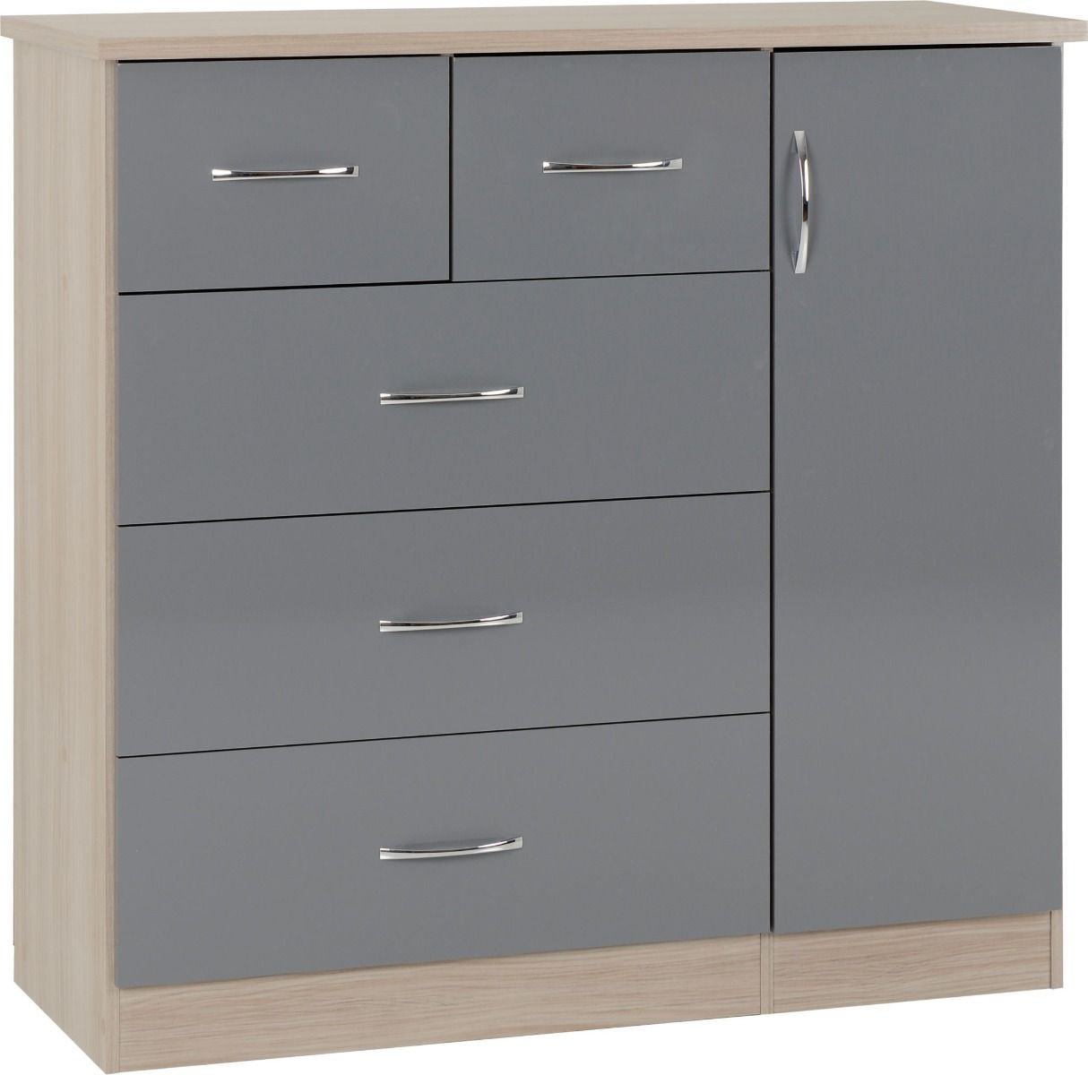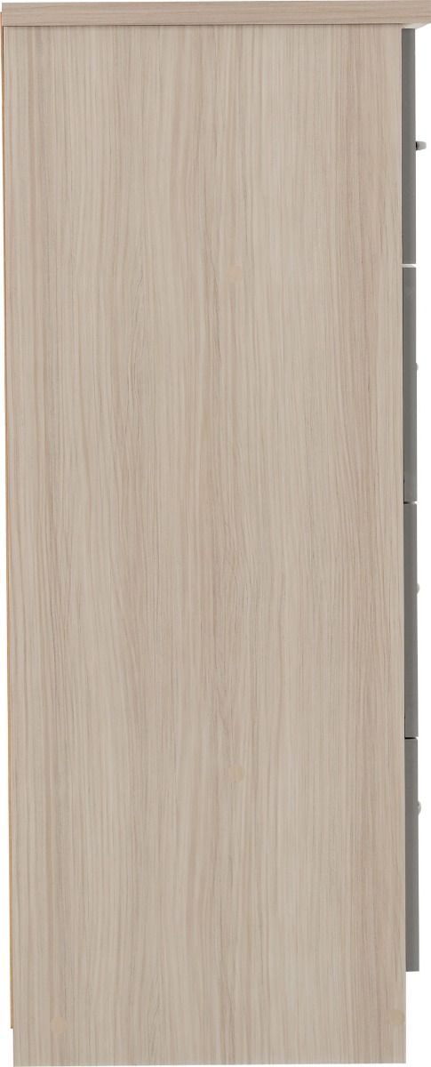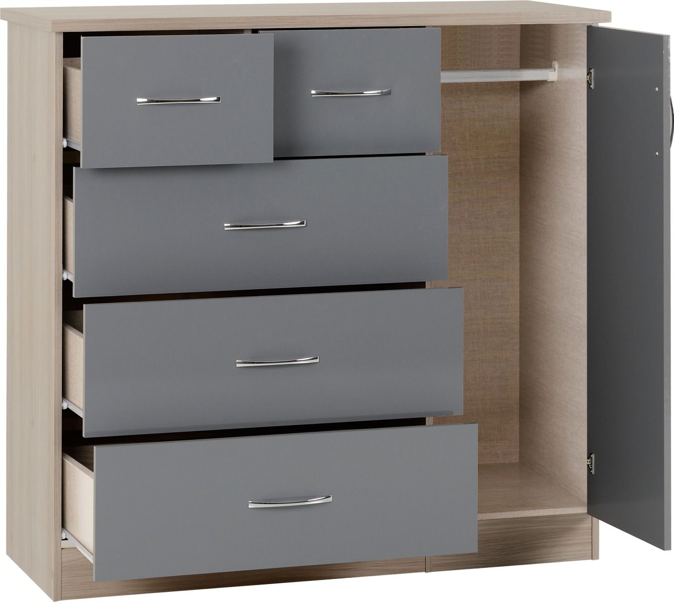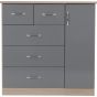 Explore the Nevada 5 Drawer Low Wardrobe, blending Grey Gloss and Light Oak Effect Veneer. Stocked abundantly at Home Done Furniture, this sleek wardrobe offers ample storage in a compact design.