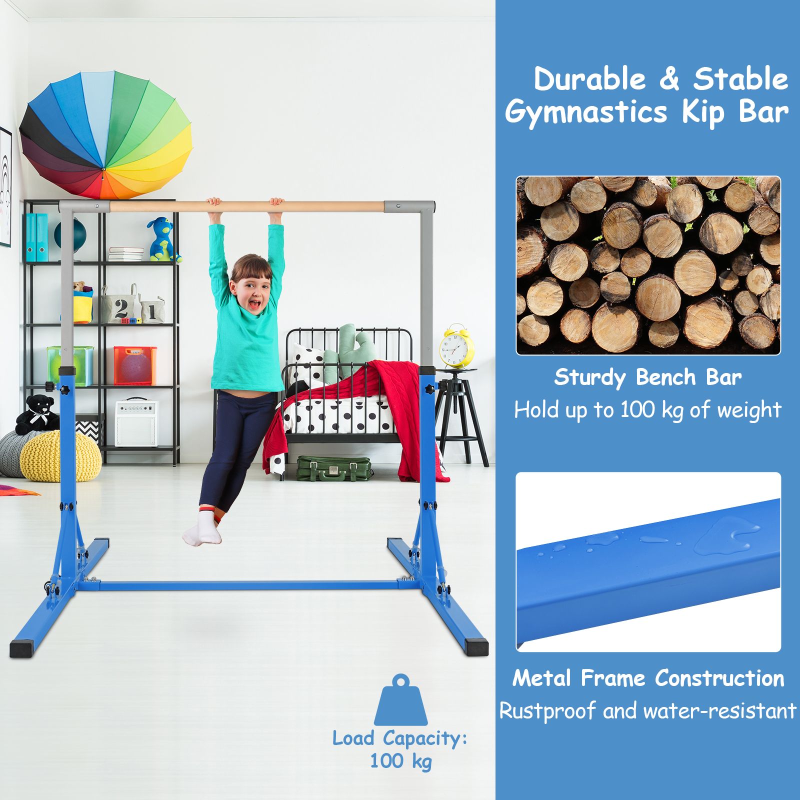 Gymnastics Bar - Kids Foldable Gymnastics Bar with 13 Adjustable Height-Blue