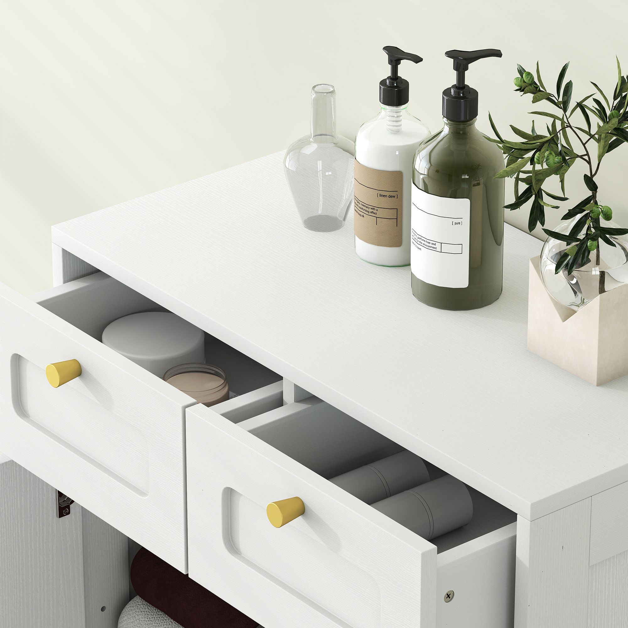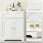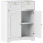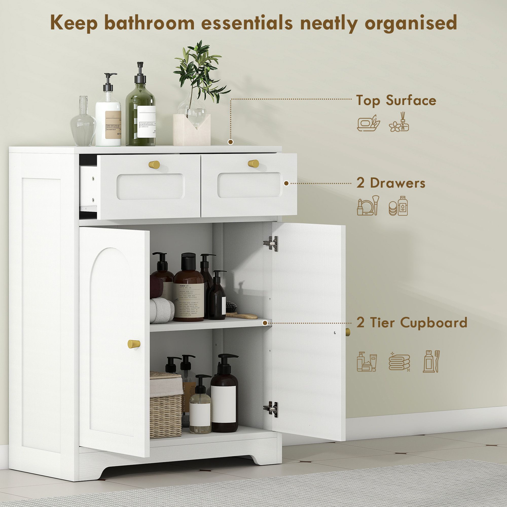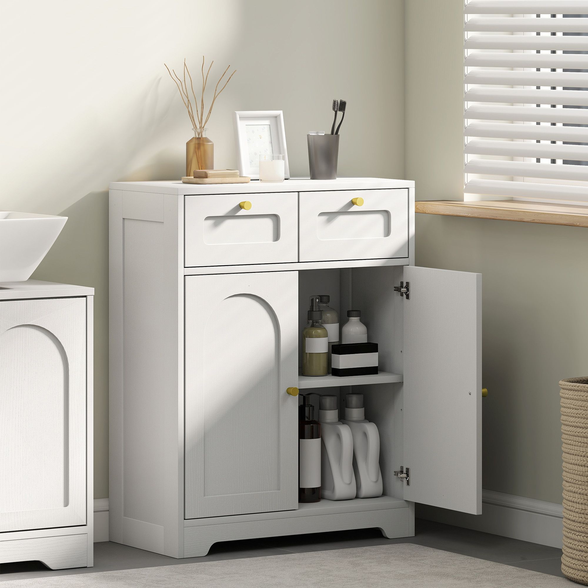 Bring calm and order to your bathroom with this stylish floor cabinet from HOMCOM. Whether it's storing spare towels, skincare, or cleaning essentials, the mix of drawers and a roomy cupboard keeps everything tucked neatly away. The adjustable shelf makes it easy to fit taller bottles, while the strong build supports up to 55 kg great for daily family use. Finished in soft white with arched doors and gold-tone touches, the bathroom storage unit adds a gentle, classic charm to your space. Multi-storage: The bathroom floor cabinet includes a flat top, two drawers and a two-tier cupboard to keep toiletries, towels and bathroom essentials neatly organised Adjustable shelf: The cupboard of the bathroom cabinet features a three-level adjustable shelf, offering flexible space to store bottles, cleaning supplies, or bulky items Solid construction: Crafted from reliable particleboard, the bathroom storage unit has a maximum load capacity of 55 kg. Including anti-tip kits ensure safety for everyday bathroom use Elegant detailing: Finished with arched door panels, gold-tone knobs and a curved base in a clean white embossed wood effect, the bathroom storage cabinetadds charm to any bathroom