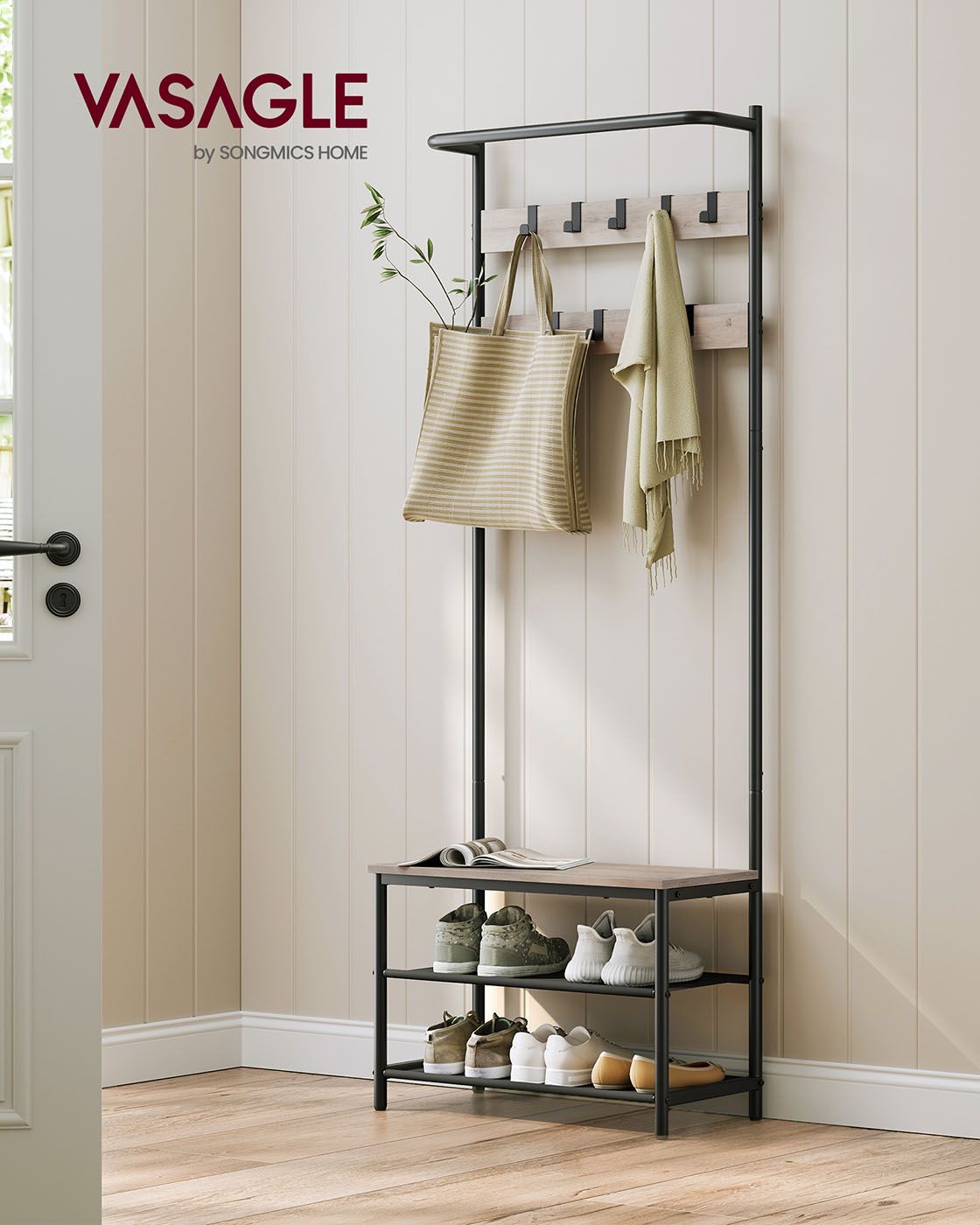 Hall Tree - VELRO Industrial Shoe Bench with 9 Hooks and Overhead Bar - Black