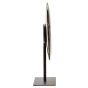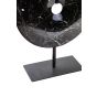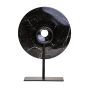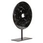 The HALVIORA small round sculpture boasts a smooth black marble disc with natural veining, elegantly displayed on a complementing black-finish metal stand.