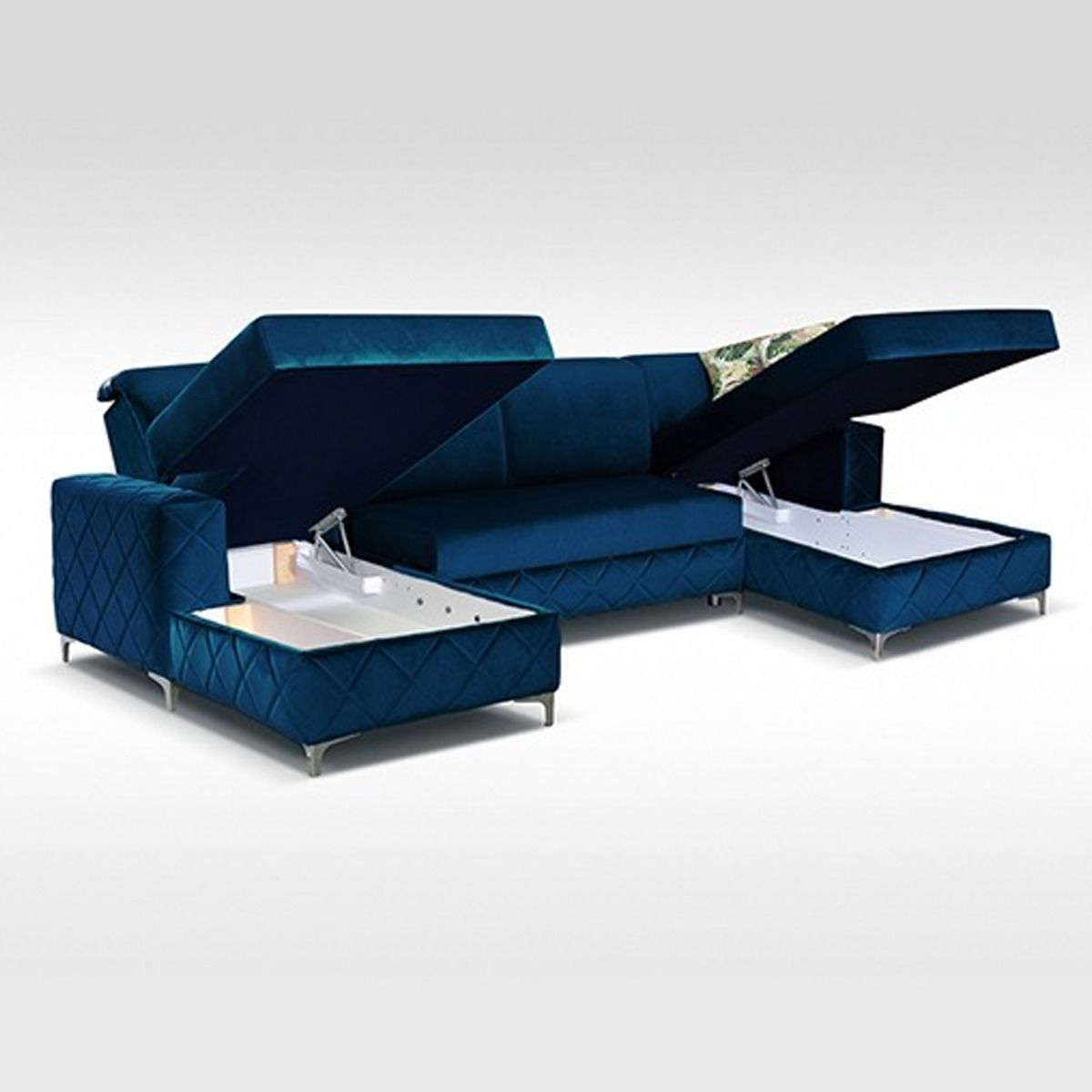 Hamilton Diamond Design Velvet Fabric Large Sofabed with Ottoman Storage - Blue