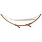 Let your thoughts run off while swinging on this delightful garden hammock. The robust, arched frame is constructed with strong yet flexible larch wood, firmly holding the hammock while allowing for effortless swinging at the same time. Cotton canvas is incredibly smooth to touch, inviting to lay down and rest a bit. A spectacular piece of outdoor furniture matches best with contemporary decors. Details: Color: White, Dark Wood. Main material: Larch Wood. Additional material: Cotton. Material Composition: 100% Cotton Weight: 43 Assembly: Full Assembly Required Wood type: Larix gmelinii (Rupr.) Wood Origin: Russia Weight Capacity: 150 Seat Height: 57