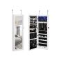 special jewelry cabinet with diversifying use must meet your different needs. Putting in dressing room is perfect with generous and elegant looking. At the same time, it has large capacity with drawers, hooks and small storage compartments like five grids, two drawers, a shelf for scarves, a jewelry pouch, 84 ring frames, 84 earring hooks, 48 earring jack studs, 32 necklace hooks. Meanwhile, it is safe and clean with lock cabinet and magnetic function door. So white wall / door-mount mirrored jewelry cabinet is the ideal choice to organize your jewelry and beauty items.Precautions:- The hooks are suitable for the door which thickness is about 4 cm, the gap at the top of the door should be greater than 3 mm.- Fragile, please handle carefully and prevent breaking mirror due to cabinet dumping.- LED lights battery are AAA x 3 / LR03 x 3, not in delivery scope.- Please remove the LED lights battery if do not use in long time.Product Parameters: