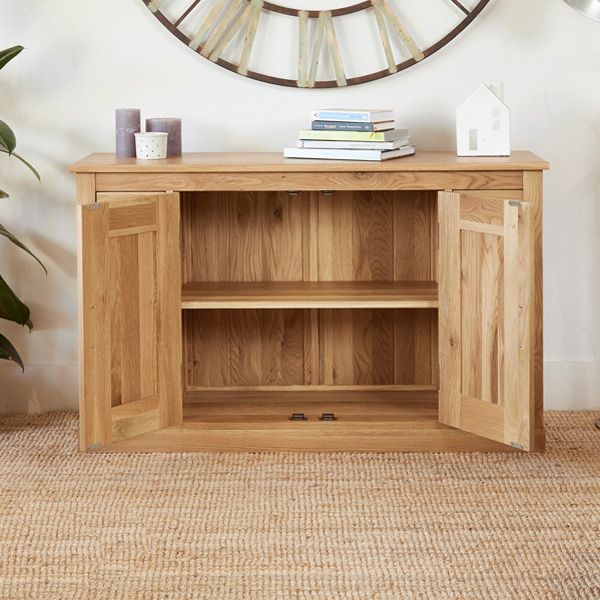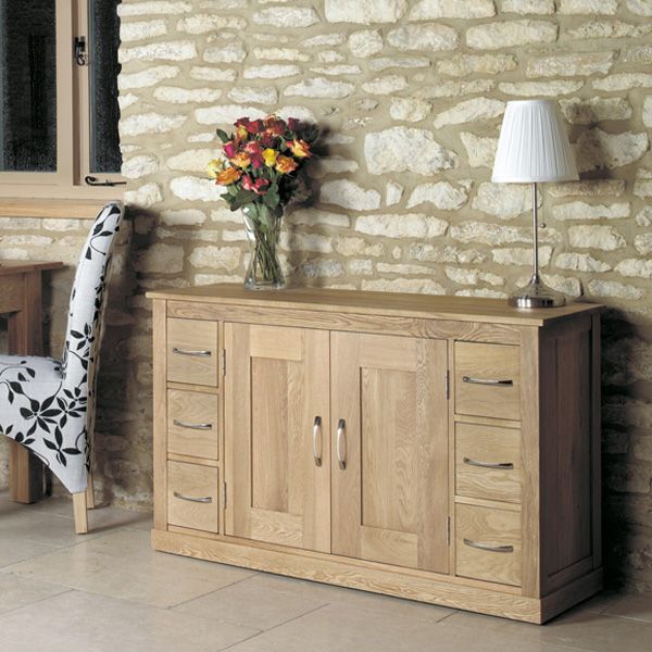 Enhance your dining room with the superb contemporary Harriet Oak Sideboard. Crafted from the highest grade, selected solid oak, this sideboard boasts exceptional build quality designed to last a lifetime. It features a large cupboard with an adjustable 3-position shelf, offering versatile storage options, while the six spacious drawers are perfect for organizing CDs or other items. The tongue and groove hardwood back and drawer inners, along with dovetailed drawer joints, ensure durability and strength.