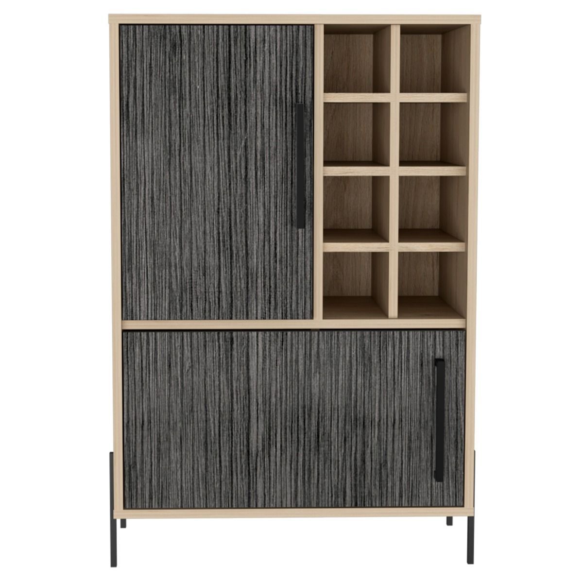 Our Compact drinks cabinet features ample storage for bottles and glasware and is a stylish acompanyment to any room. Made in an easy to clean, hardwearing washed oak and carbon grey oak effect melamine finish with real metal hardware.
