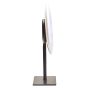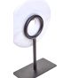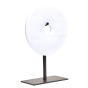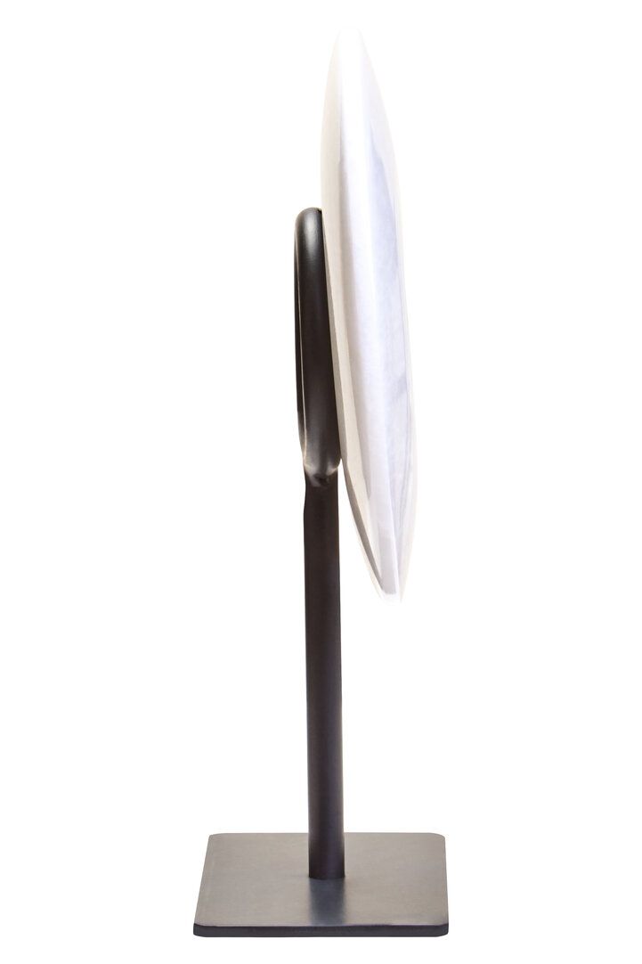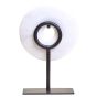 The HAVERLYN extra small round sculpture boasts a smooth white marble disc with natural veining, elegantly displayed on a sleek, black-finish metal stand.