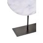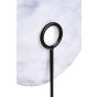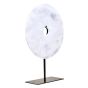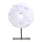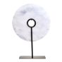 The HAVERLYN large round sculpture boasts a smooth white marble disc with natural veining, elegantly displayed on a sleek, black-finish metal stand.