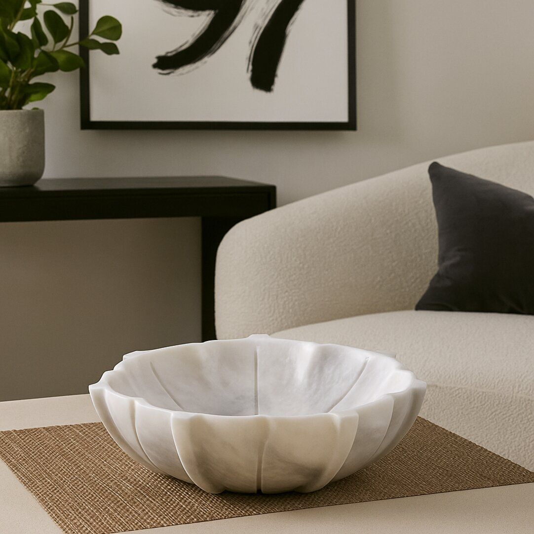 The HAVERLYN lotus-shaped white marble bowl features sculpted petal edges and a polished finish, perfect for adding a refined decorative touch to the interior.