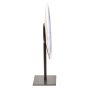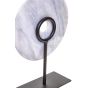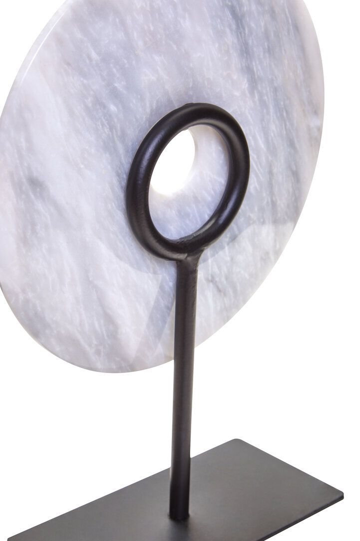 The HAVERLYN small round sculpture boasts a smooth white marble disc with natural veining, elegantly displayed on a sleek, black-finish metal stand.