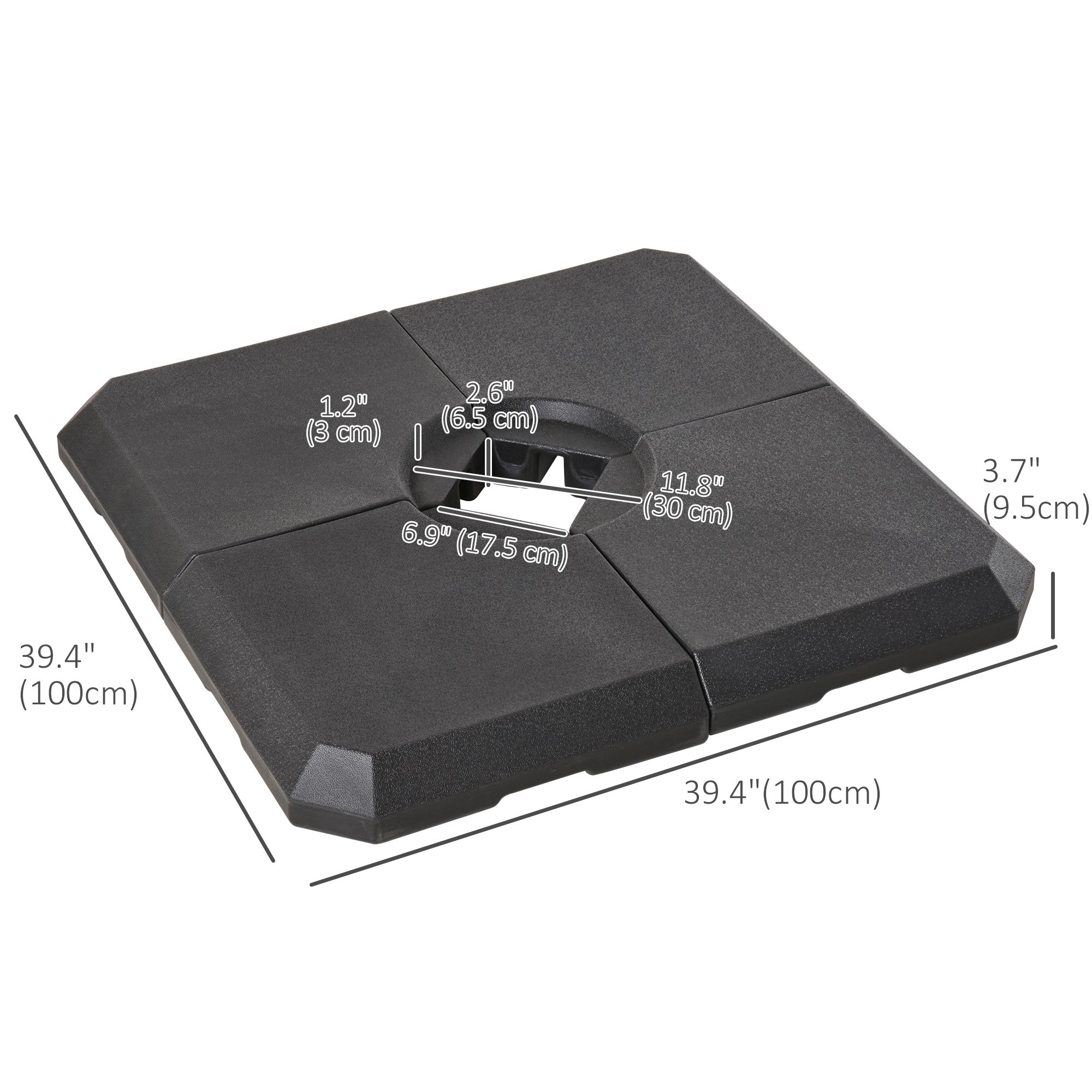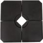 - Four-piece set, with all pieces slotting together on a cross base for parasols Filling holes on each side, each piece fills to a maximum of 20kg water or 30kg – making it easy to store and carry when empty
