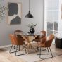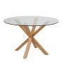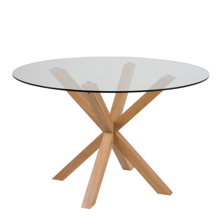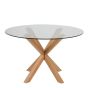 Delight in the contemporary allure of this round dining table, which boasts a clear tempered glass top for a sleek, modern look. The distinctive oak foil steel cross base adds a touch of elegance, making it a striking centerpiece for any dining area.