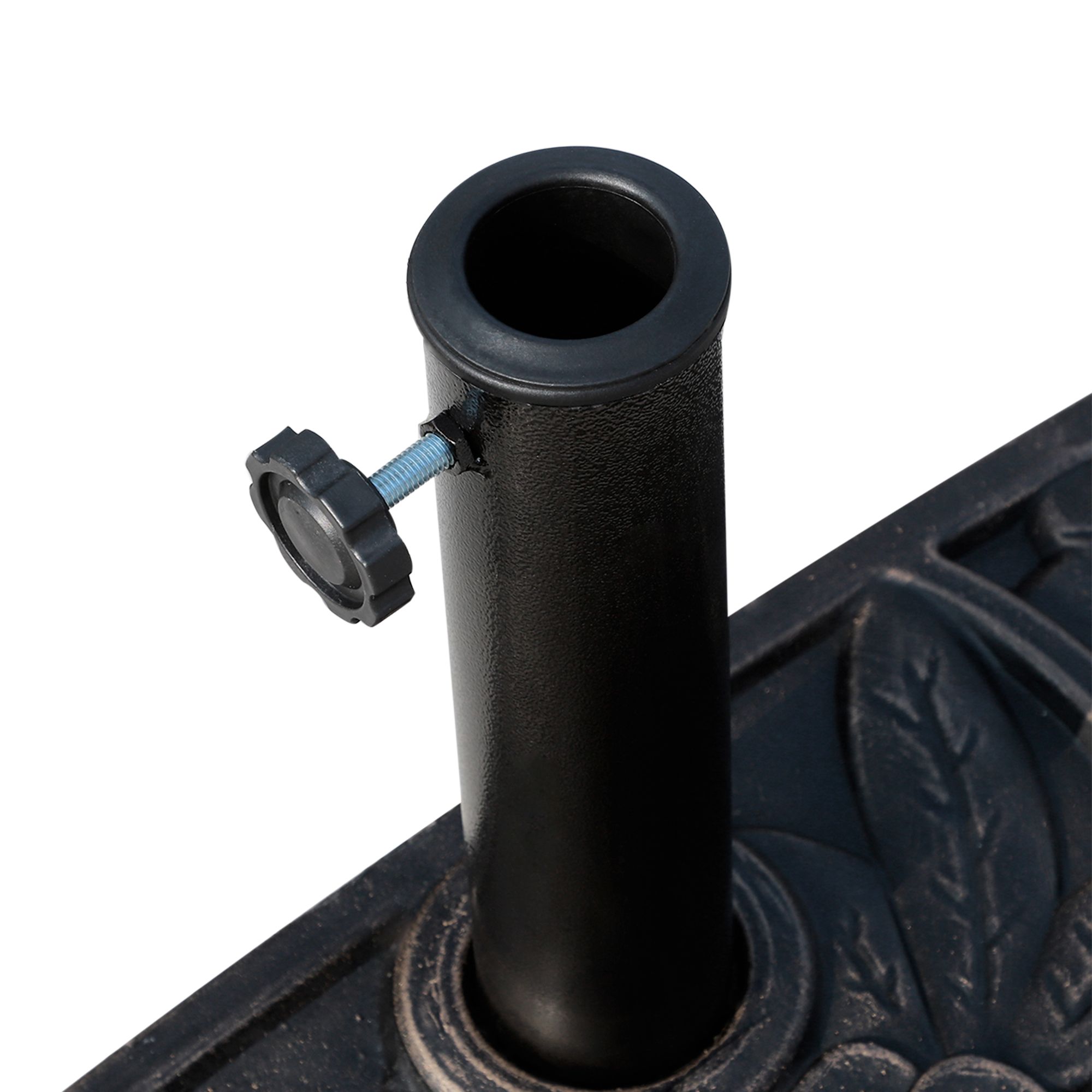 This half round parasol base is a great accessory to have to accompany your half round parasol. Design to work perfectly this this type of parasol, it will be able to reduce the amount of space it takes. The base has a flower pattern to suit any outdoor setting, it holds the umbrella pole securely and evenly in place. This is a necessary item to have to complete your outdoor setting.