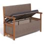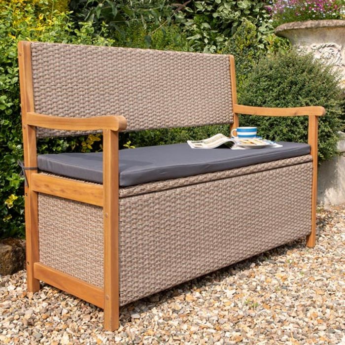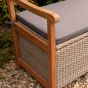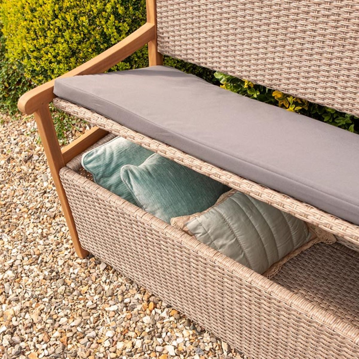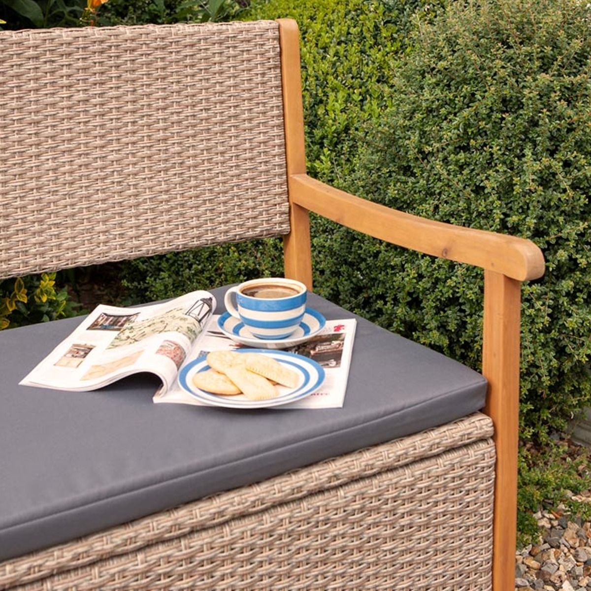 It comfortably seats up to two people and includes a grey seat pad for added comfort. Perfect for both indoor and outdoor use, the Helen Range Rattan Storage Bench offers a practical and elegant solution for seating and storage.