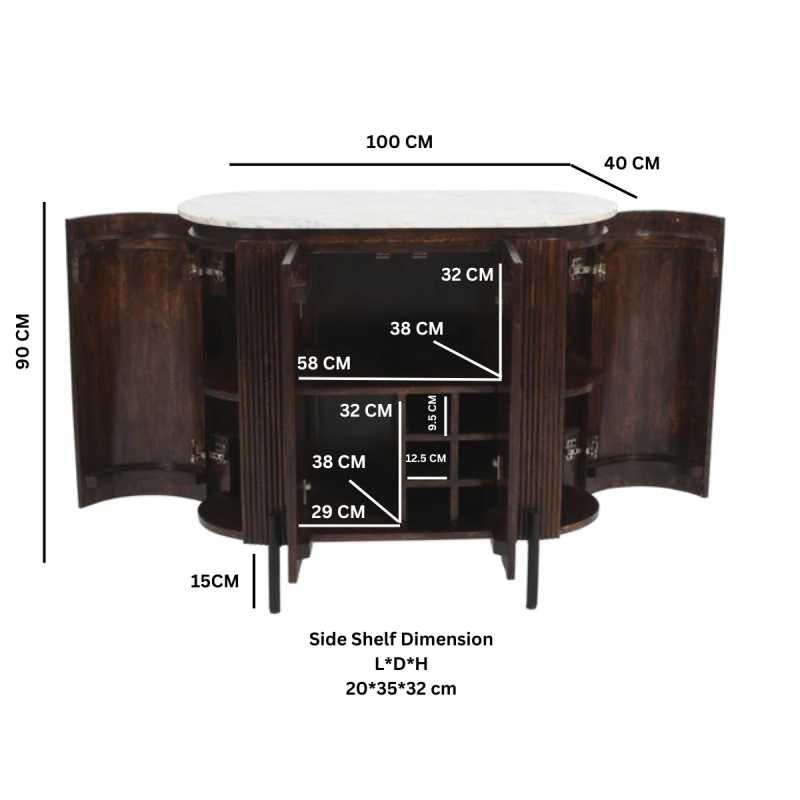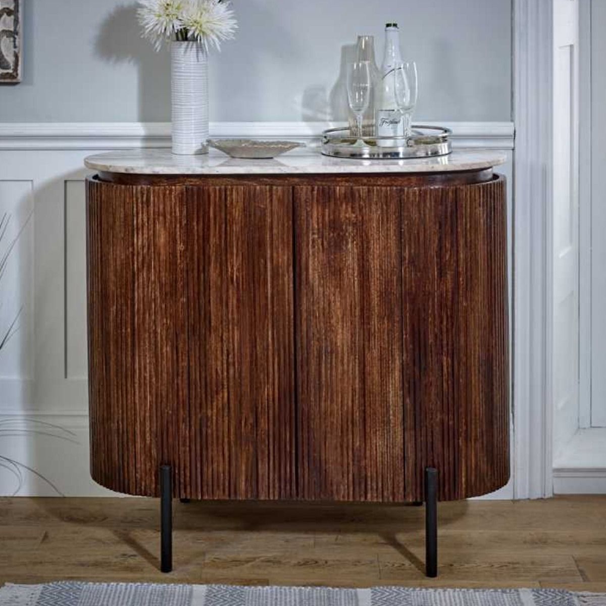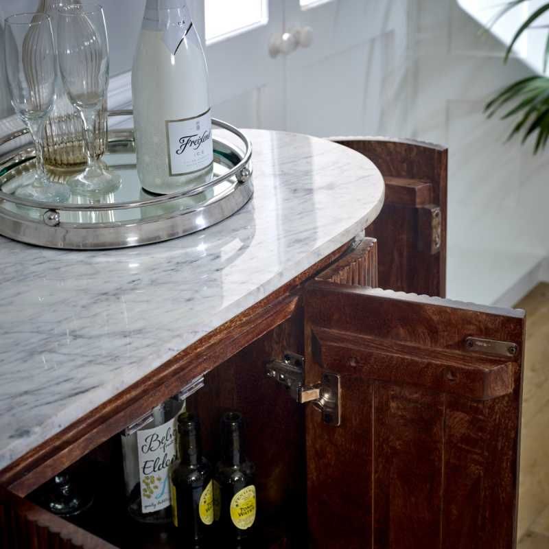 The sleek and stylish design of this sideboard / drinks cabinet hide a multitude of storage behind the doors. Featuring 4 doors there is ample shelving available for drinks bottles and glasses, or double as a sideboard for books / games etc. The elegant marble top will stand the test of time and the Artwork fluted mango wood surround compliments it perfectly.