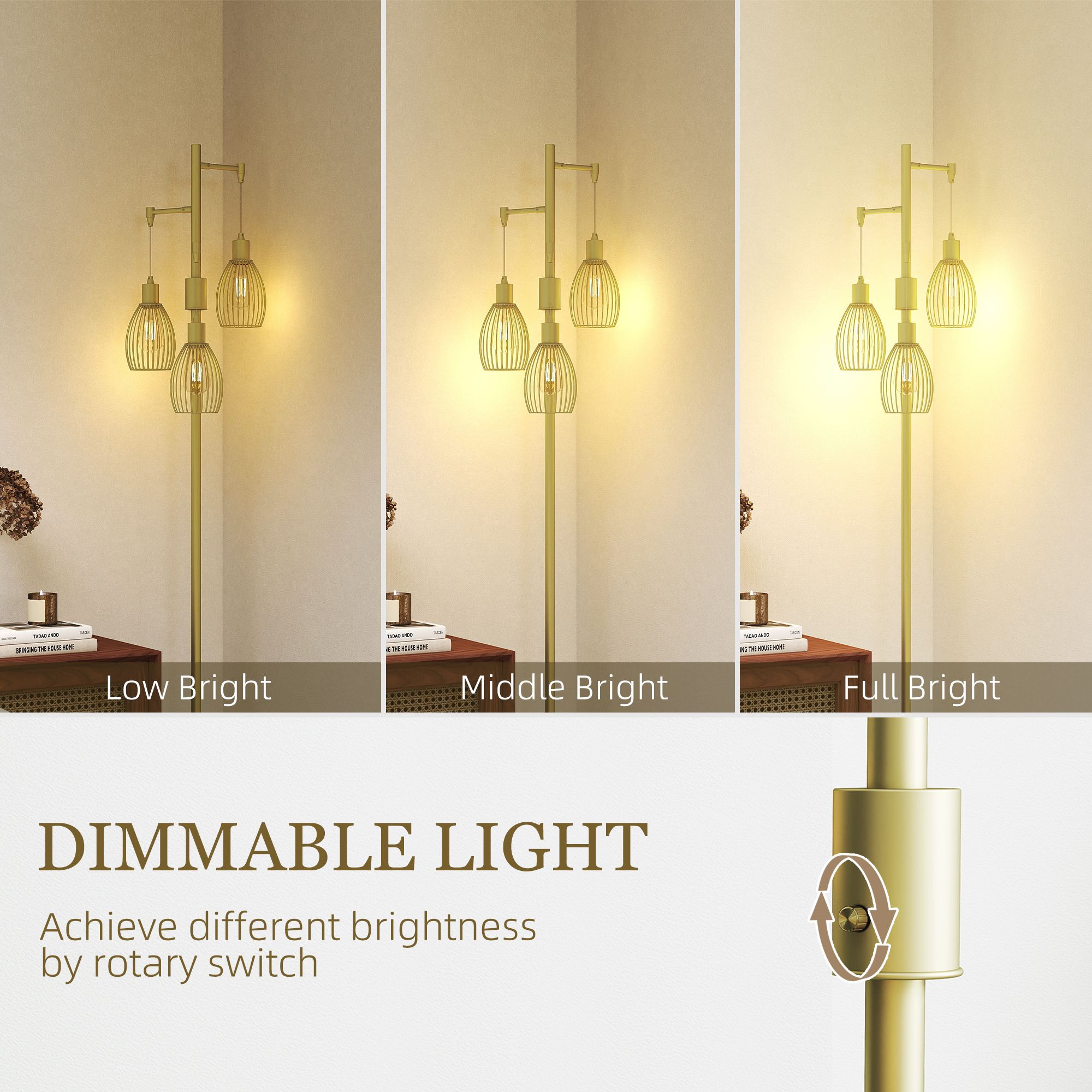 HERON 170cm Industrial 3-Light Floor Lamp, Dimmable Standing Lamp with Steel Lampshades for Living Room, Bedroom, Dinging Room, Study, Gold Tone