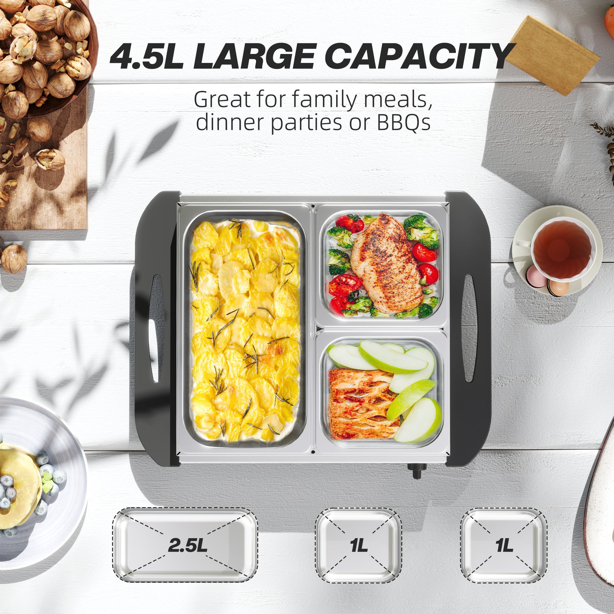 HERON 4.5L Stainless Steel Electric Buffet Server 3x Trays Lids Set of 2