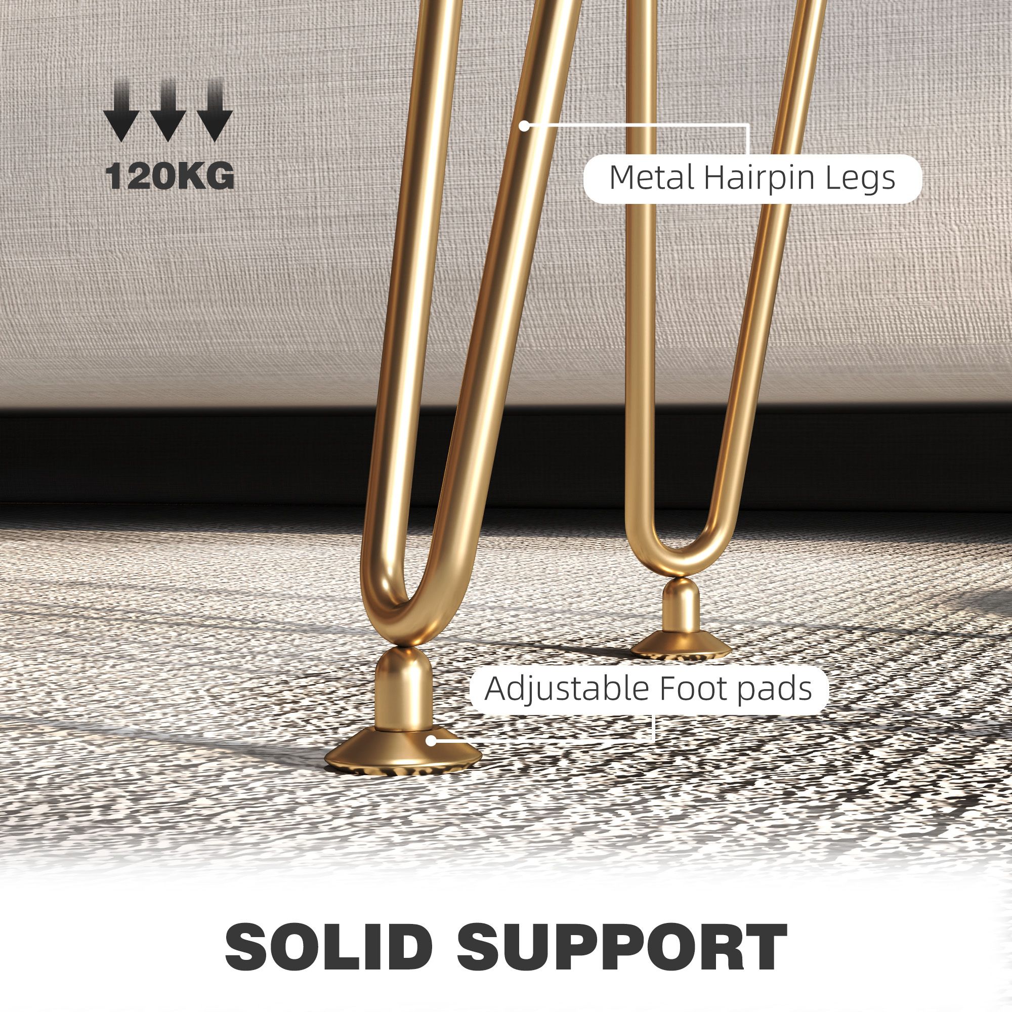 Luxurious functionality in the home with this HERON ottoman. Inside it has a 5L storage space, making room for plenty of smaller items. Wrapped in velvet-feel upholstery this is a soft and beautiful piece which looks great wherever you stand it, complete with gold coloured metal hairpin legs for strong support.