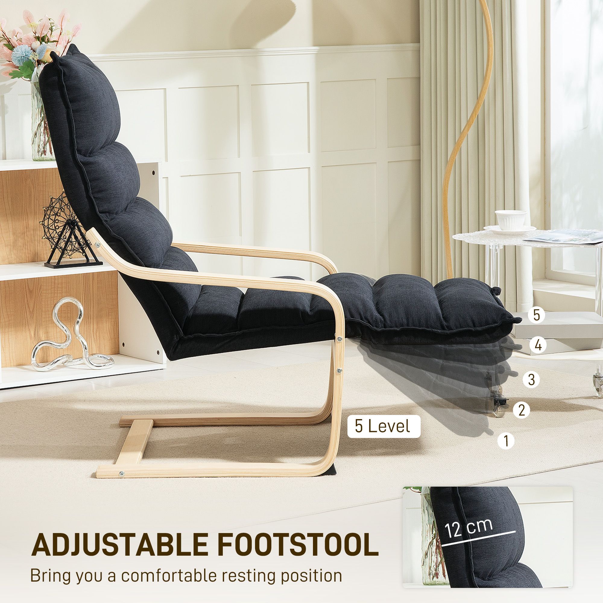 HERON Curved Wooden Accent Chair, with Adjustable Footrest - Black